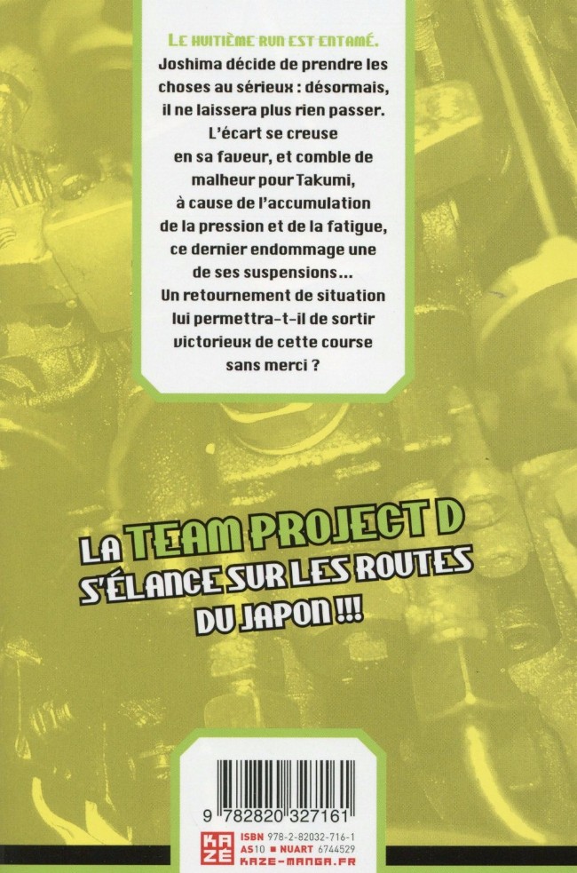 Résumé: Le huitième run est entamé. Joshima décide de prendre les choses au sérieux : désormais, il ne laissera plus rien laisser passer. L'écart se creuse en sa faveur, et comble de malheur pour Takumi, à cause de l'accumulation de la pression et de la fatigue, ce dernier endommage une de ses suspensions. Un retournement de situation lui permettra-t-il de sortir victorieux de cette course sans merci ?