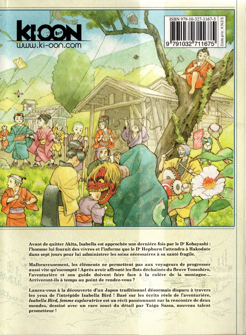 Résumé: Le Japon du XIXe siècle hors des sentiers battus !Avant de quitter Akita, Isabella est approchée une dernière fois par le Dr Kobayashi : l'homme lui fournit des vivres et l'informe que le Dr Hepburn l'attendra à Hakodate dans sept jours pour lui administrer les soins nécessaires à sa santé fragile.Malheureusement, les éléments ne permettent pas aux voyageurs de progresser aussi vite qu'escompté ! Après avoir affronté les flots déchaînés du fleuve Yoneshiro, l'aventurière et son guide doivent faire face à la colère de la montagne... Arriveront-ils à temps au point de rendez-vous ?Lancez-vous à la découverte d'un Japon traditionnel désormais disparu à travers les yeux de l'intrépide Isabella Bird ! Basé sur les écrits réels de l'aventurière, Isabella Bird, femme exploratrice est un récit passionnant sur la rencontre de deux mondes, dessiné avec un rare souci du détail par Taiga Sassa, nouveau talent prometteur !