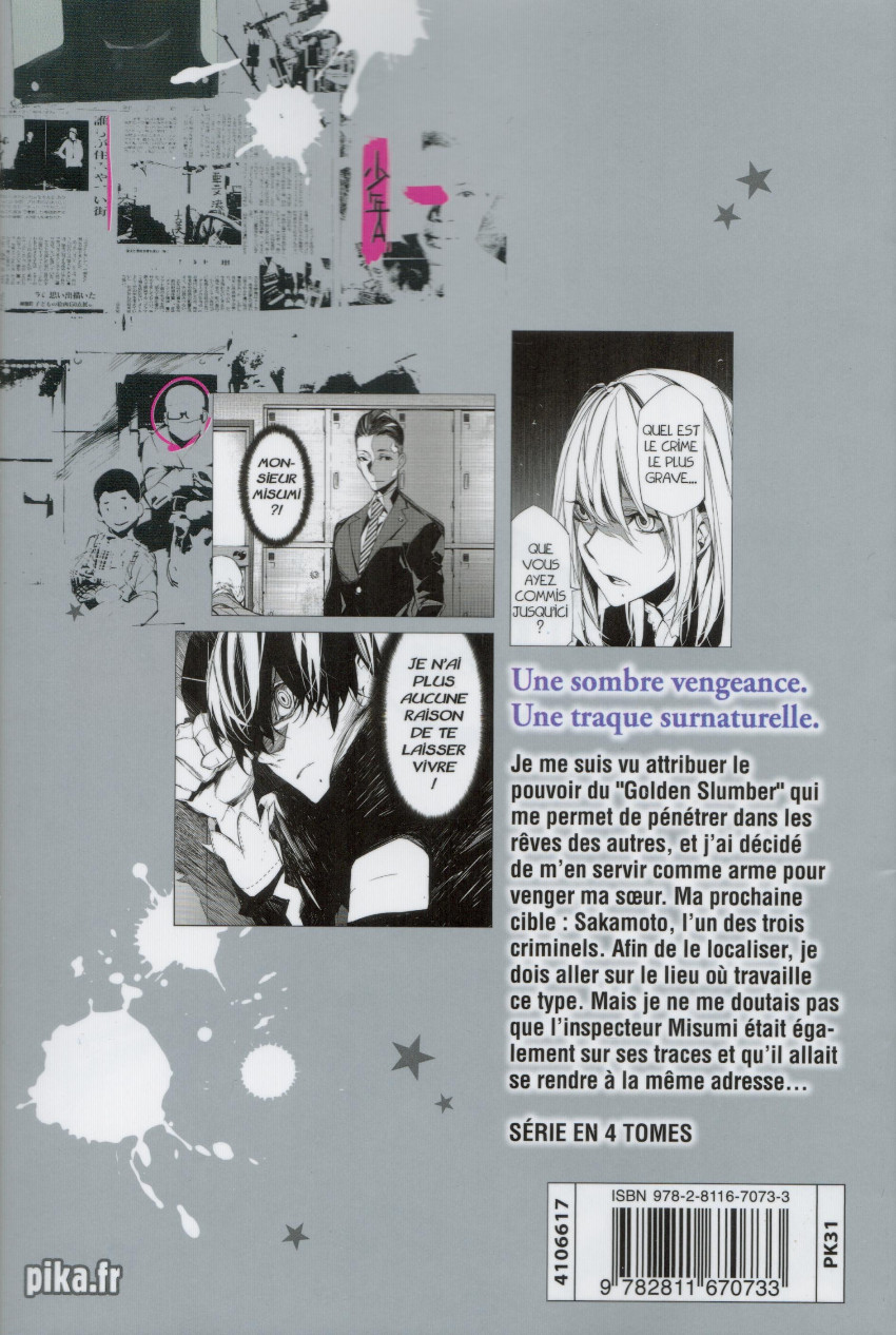 Résumé: Je me suis vu attribuer le pouvoir du "Golden Slumber" qui me permet de pénétrer dans les rêves des autres, et j'ai décidé de m'en servir comme arme pour venger ma soeur. Ma prochaine cible : Sakamoto, l'un des trois criminels. Afin de le localiser, je me présente sur le lieu où travaille ce type. Mais j'étais loin de me douter que l'inspecteur Misumi était également sur ses traces et qu'il se rend à la même adresse...