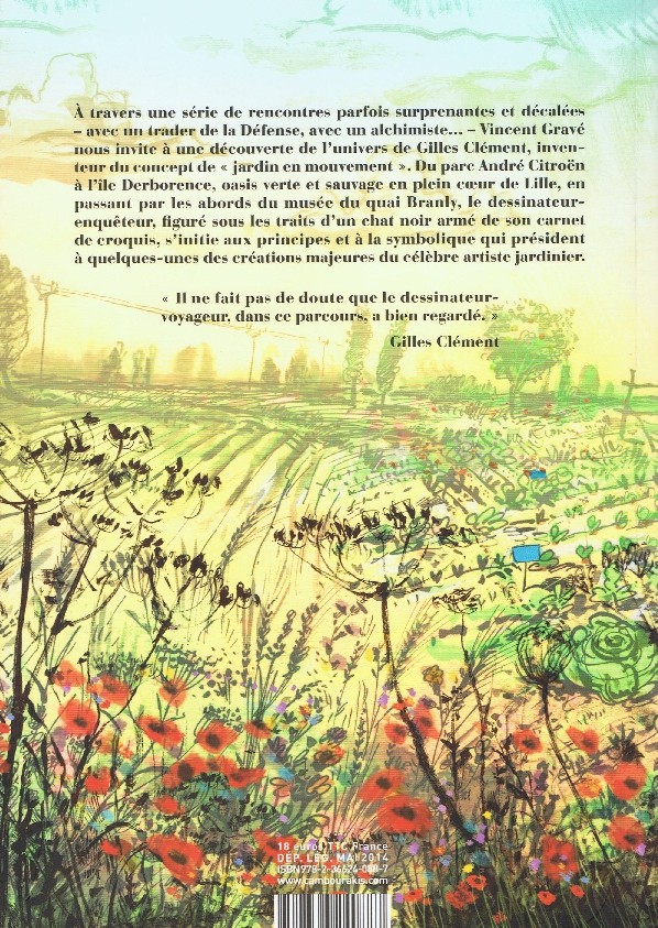 Résumé: À travers une série de rencontres parfois surprenantes et décalées – avec un trader de la défense ou un féru d’alchimie…– Vincent Gravé nous invite à une découverte de l’univers de Gilles Clément, inventeur du concept de « jardin en mouvement ». Du parc André Citroën à l’île Derborence, oasis verte et sauvage en plein coeur de Lille, en passant par le Musée des arts premiers du quai Branly, le dessinateur – enquêteur – figuré sous les traits d’un chat noir armé de son carnet de croquis – s’initie aux principes et à la symbolique qui président à quelques unes des créations majeures du jardinier devenu professeur au collège de France. L’album se termine par une conversation avec le maître lui-même, dans l’intimité de son jardin personnel, créé autour de sa maison de campagne creusoise, véritable matrice et terrain d’expérimentation nourrissant ses grandes créations publiques.