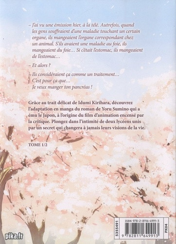 Résumé: Sakura est une lycéenne à la personnalité solaire, toujours entourée d'amis et au centre de l'attention de la classe. Elle est aux antipodes de Haruki, un simple élève banal et transparent. Celui-ci préfère fuir son prochain pour se réfugier dans ses livres de fiction jusqu'au jour où il trouve un journal intime, celui de Sakura. Il découvre alors que cette camarade si pleine de vie souffre d'une infection du pancréas et que ses jours sont comptés... Unis à Haruki par ce secret, Sakura demande une faveur au garçon : vivre avec elle une vie entière le temps d'un printemps...
