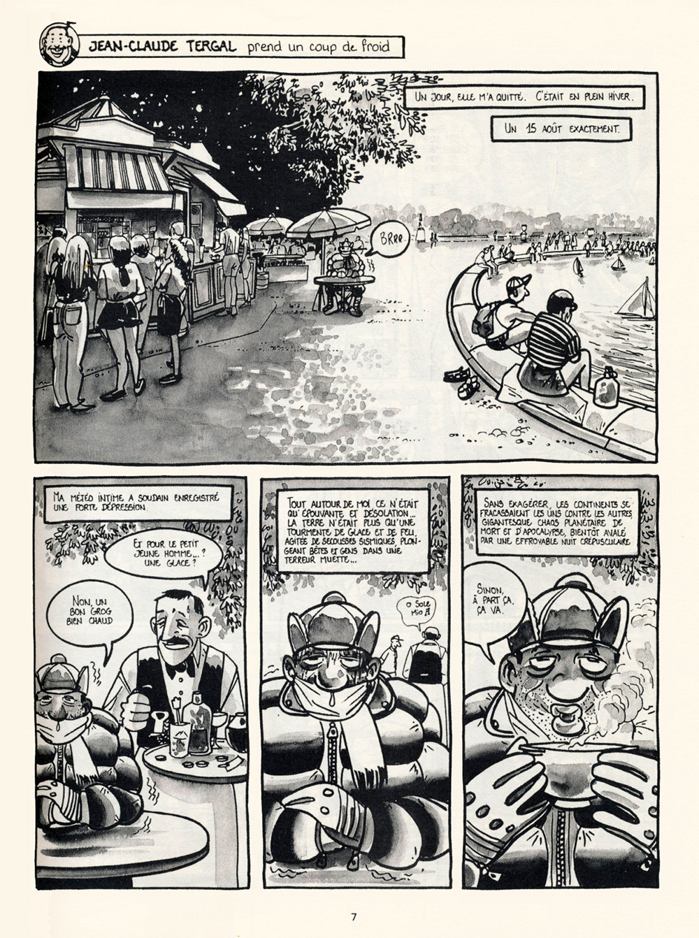 Une première histoire qui pose le personnage mais pas totalement le style absurde qui va plus sur du délire à la Moerell que sur ce dont je me souviens de Tergal Et puis Jean-Claude tente d'oublier sa meuf et on glisse tranquillement dans le personnage pauvre type pas de bol looser. De l’absurde ici et là, qui n’est pas ce qui m’amuse le plus, comme son amour pour le lavabo qu’il le voit fréquenter la baignoire. Mais, de plus en plus souvent au fur et à mesure du tome, Jean-Claude qui se ment, qui transforme la réalité à croire que la fille le regrette. On bascule dans un absurde plus réaliste avec ces lettres qu’il reçoit de la Poste ou EDF et où il cherche une signification à son histoire. Et puis ça devient plus pathétique quand il laisse des messages sur le répondeur dont le nouveau mec profite, qu’il la pense attristée de son départ... Il y a de la tendresse noire dans cet humour triste, un entre-deux entre délire et désespoir qui fonctionne super bien à mon goût.Le 02/11/2005 à 22:09:37