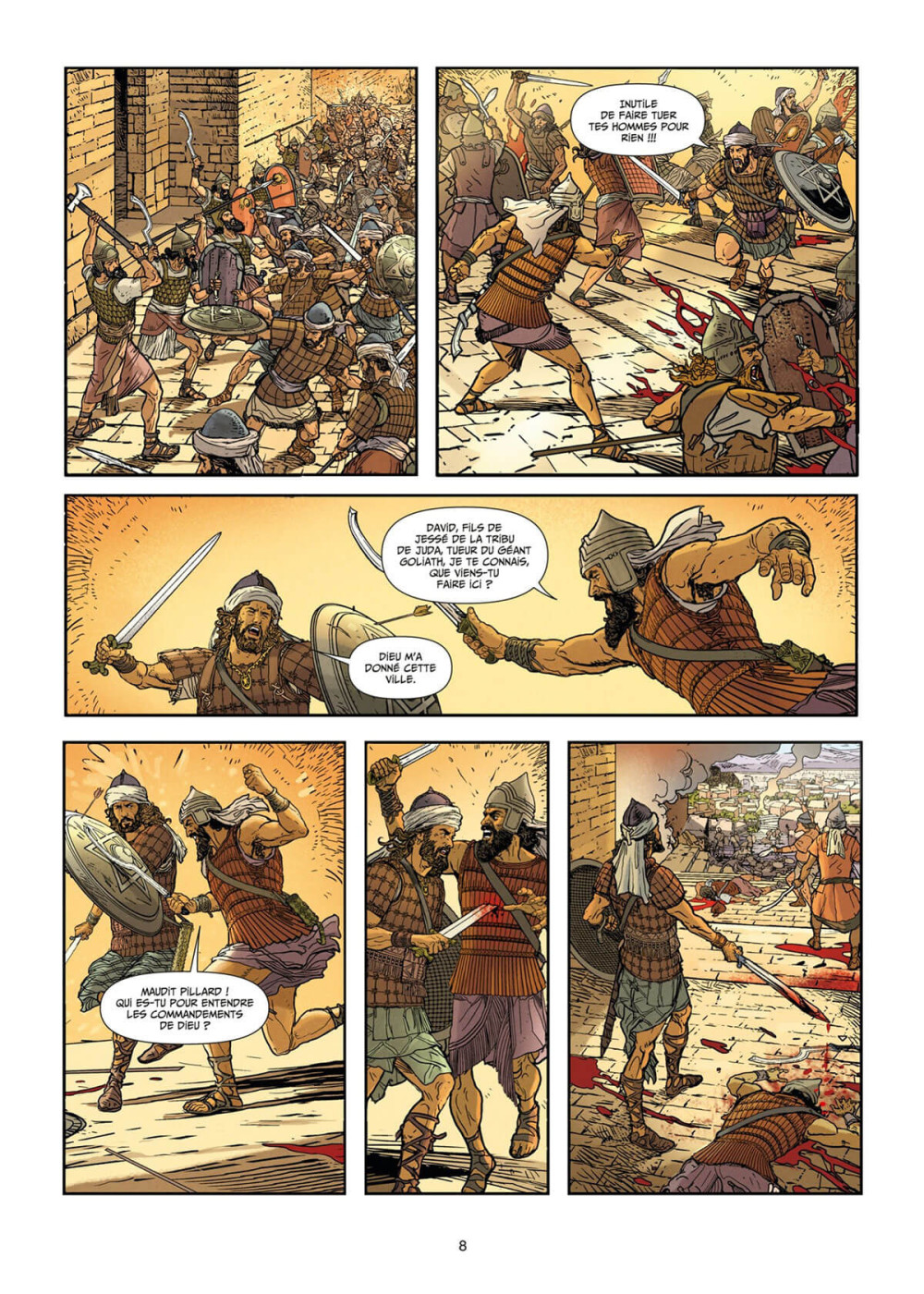 Le destin du hameau bifurque lorsque celui qui a terrassé Goliath s’y impose l’épée à la main. Il entreprend d’établir la grandeur du lieu, notamment en y installant l’arche d’alliance. Ses descendants lui succèdent, mais, de fête en orgie, dilapident le capital politique du patriarche.