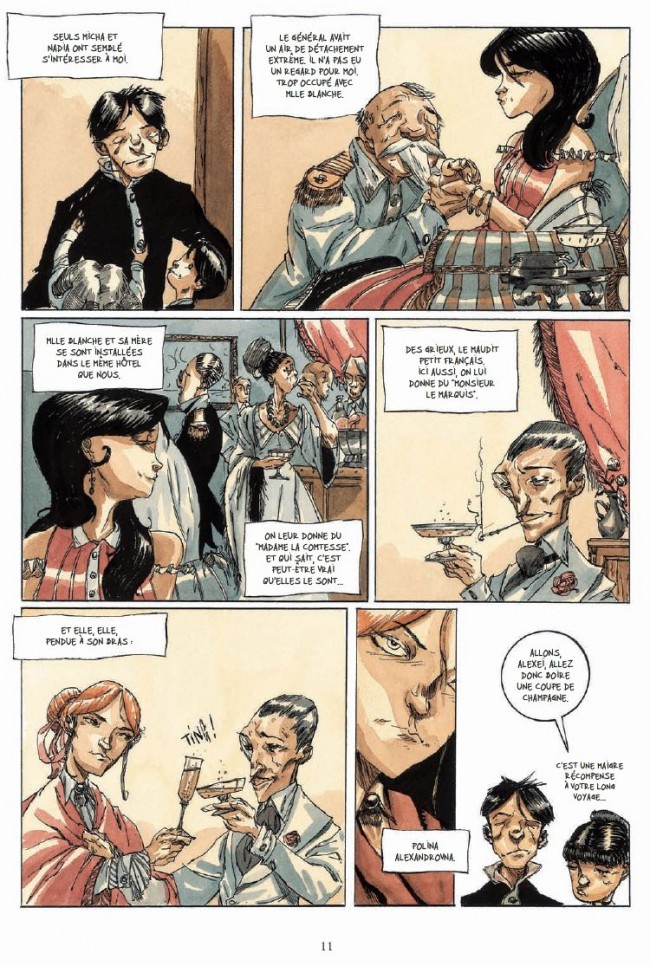 Stéphane Miquel et Loïc Godart se lancent un sacré défi en adaptant un roman aussi difficile que Le joueur de Fédor Dostoïevski, d’autant qu’il s’agit sans doute l’une des œuvres les plus personnelles de l’écrivain russe. Complètement fasciné par la roulette, Dostoïevski y consacre du temps et de l’argent. Le jeu, avec l’amour qui est un de ses affluents, fait partie intégrante de la vie. Dans son roman, tout le monde joue un jeu caché, mentant aux autres. Tous font et défont leurs amours, jouent à la roulette, se jouent des autres. C’est une addiction communicative. Stéphane Miquel fait ressortir parfaitement tous ces aspects dans son adaptation, en n’insistant pas plus sur la passion dévorante du jeu que sur l’ivresse du gain. Avec le jeu on peut être un zéro aujourd’hui et quelqu’un demain, on peut tout perdre en un instant et tout gagner ensuite mais, on ne peut pas revenir en arrière. Le courage et les qualités humaines qui manquent aux protagonistes autant qu’à Alexeï ne peuvent s’acquérir aussi facilement. Stéphane Miquel évite également le nationalisme du roman, évident pour cette fin du XIXe siècle. Ici, les personnages portent leur nationalité respective mais cela ne semble pas peser sur leur caractère ou leur façon d’agir. L’adaptation est donc assez fidèle, juste et sérieuse, mais aussi personnelle.