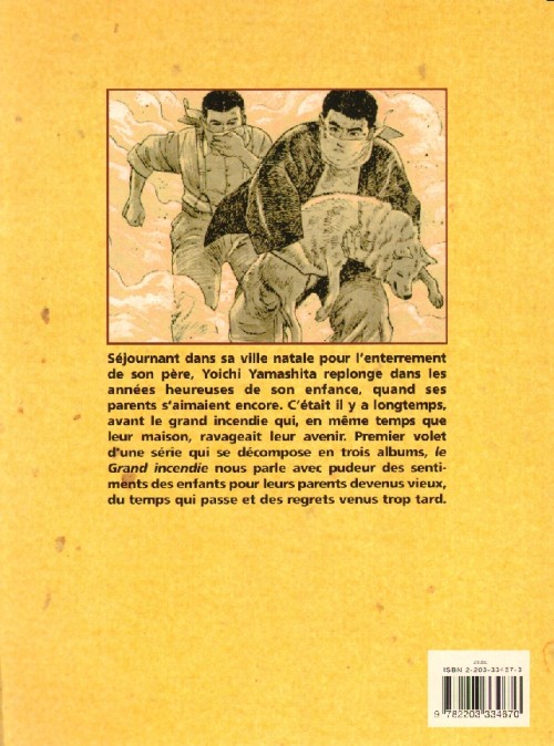 BD en noir et blanc réalisé par Jiro Taniguchi que j’ai découvert grâce à ma lecture de Quartier lointain. Quelle ne fut pas ma stupéfaction devant la découverte de ce second chef d’œuvre ! Yoichi Yamashit travaille à Tokyo. Apprenant la mort de son père, il revient après une très longue absence à Tottori, la ville qui l'a vu grandir. Au cours d'une veillée funèbre, le passé des années 50 et 60 resurgit : l'incendie qui a ravagé la ville et la maison familiale, le dur labeur pour la reconstruction, le divorce de ses parents, ses souffrances d'enfant... Lors de cette veillée, chaque membre de la famille apporte un éclairage nouveau sur la personnalité de ce père que Yoichi tenait jusque-là pour responsable du désastre familial. Le fils réalise finalement, mais trop tard, qu'il a sans doute été le seul responsable de leur douloureuse incompréhension. J’aime le style de l’auteur, la profondeur de ses personnages sensibles et touchant. On vit intensément dans la peau du personnage central tout en découvrant les traditions japonaises. C’est du grand art ! Sublime dans tous les sens du terme ! Même le trait du dessin permet de décalquer les émotions ressenties par les personnages. Jamais encore une BD ne m’avait laissé échapper quelques larmes. Cela renvoi incontestablement à des moments de vie que nous pourrions personnellement vivre. Note Dessin : 4.5/5 – Note Scénario : 5/5 – Note Globale : 4.75/5Le 22/08/2018 à 10:34:59