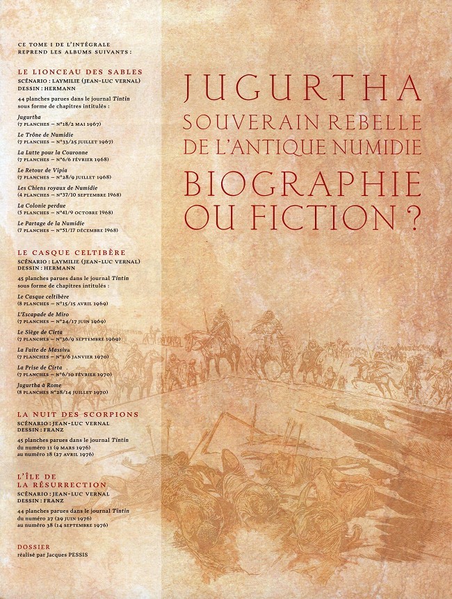 Un bon petit dossier assez conséquent pour cette 1ère intégrale. Plutôt rare de la part du Lombard, mais agréable qui relate l'histoire pleine de rebondissements de cette série. Les 2 premiers tomes en collaboration avec Hermann relate l'histoire 'vraie' de Jugurtha (voir dossier et controverse). Des épisodes d'une moyenne de 7 ou 8 planches en général, sympa à lire, retraçant les grands moments de la vie de notre héros. Ce n'est pas le Hermann de Bernard Prince ou Comanche, étant débutant mais son dessin s'améliore grandement au fil des planches. Pour les tomes 3 et 4, Vernal opte pour une vision imagée de ce qu'aurait pu être la vie de notre monarque Numide. Une évasion des geôles de Rome suivie d'une grande épopée. Plein d'humour notamment grâce à la présence de Chabrias. Les sentiments sont sommes toutes encore assez naïfs mais on a le droit a de la grande aventure servie par un Franz en grande forme ! Pour le coup Franz a dépassé et sublimé le dessin d'Hermann. Jugurtha est une série 'historique' dans tous les sens du terme, mêlant petite et grande histoire sur une trame romanesque. On aime le côté didactique des planches qui présente les différentes troupes (cavaliers, fantassins, archers), métiers, typologie du terrain ... Un tome 1 très bon, où l'on ne s'ennuie guère servit par de bons dessins, un scénario travaillé, une dose d'humour juste ce qu'il faut et de l'aventure ! Une autre pépite de l'âge d'or. Que demande le peuple si ce n'est la suite ;)BDGest 2014 - Tous droits réservés