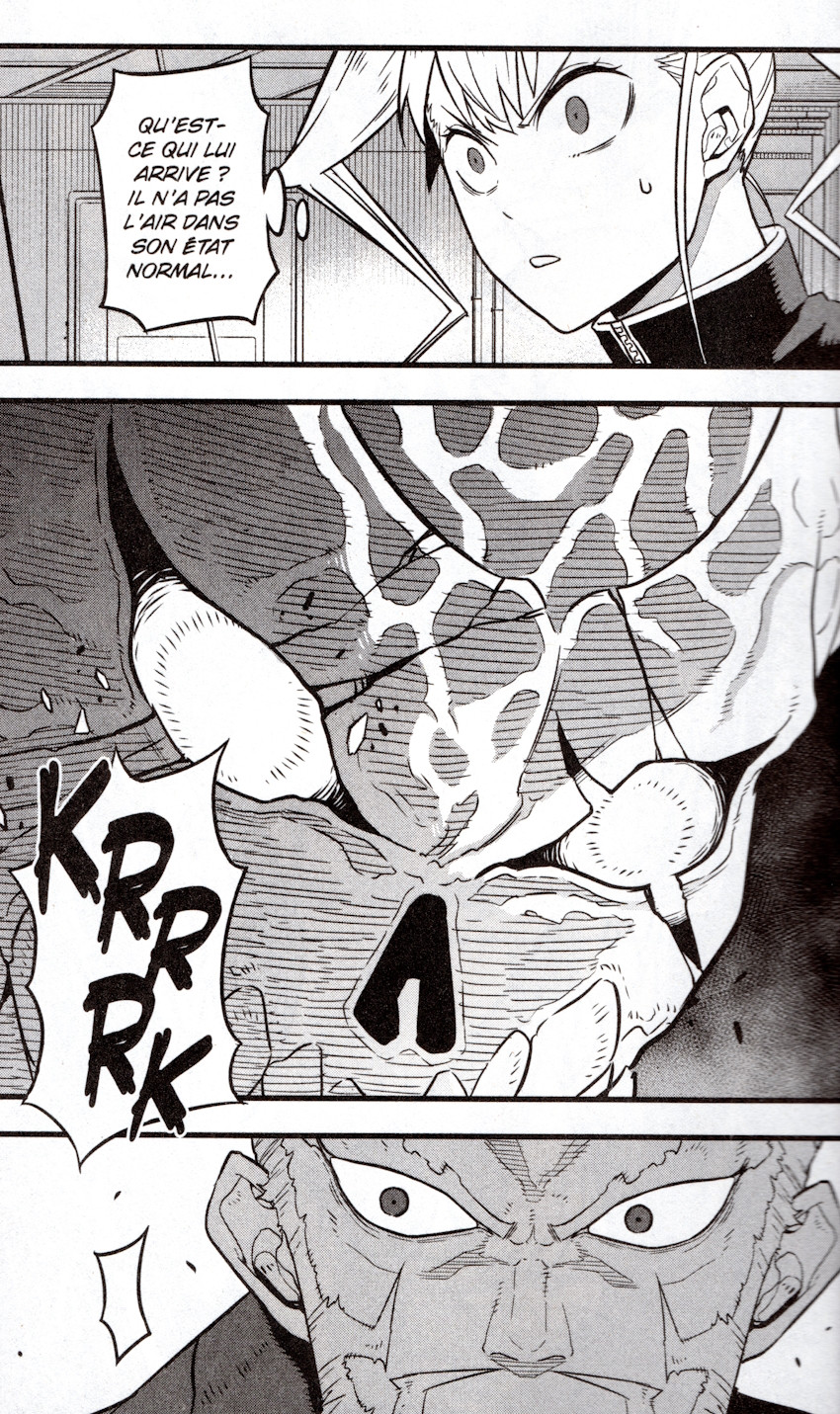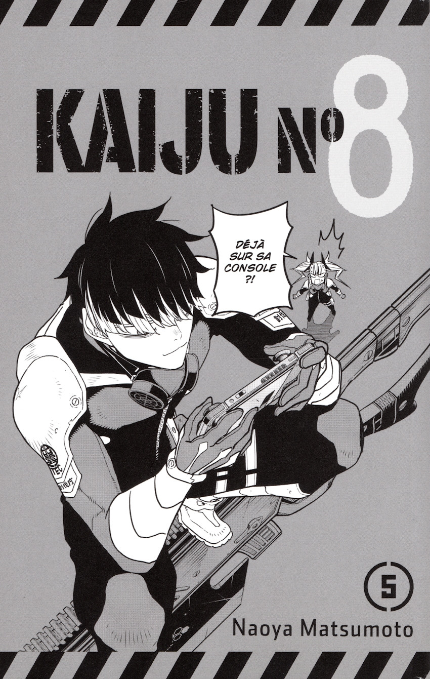 Résumé: Démasqué et capturé par les Forces de Défense, qui le considèrent comme une menace, Kafka se trouve face au directeur Isao Shinomiya, venu en personne procéder à son exécution. Luttant sans relâche pour prouver sa nature d'être humain, Kafka perd malheureusement la maîtrise de son pouvoir face à la puissance du Kaiju n° 2. Parviendra-t-il à ramener le n° 8 sous contrôle avant qu'il soit trop tard ?!