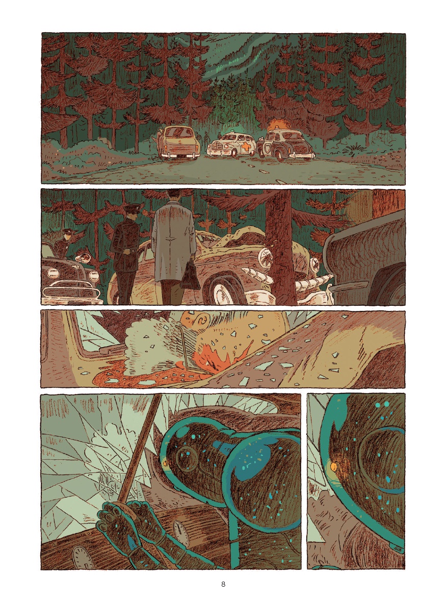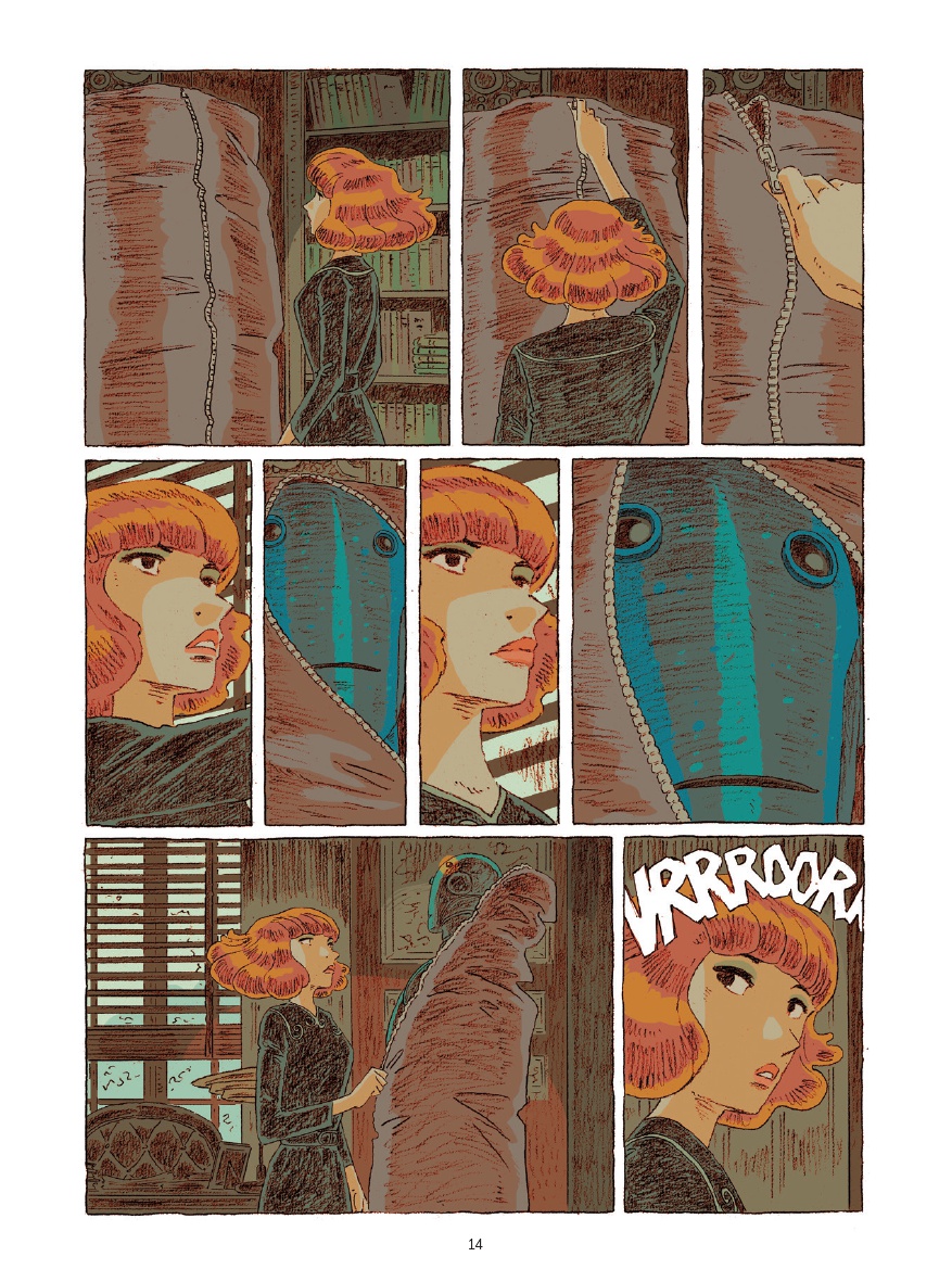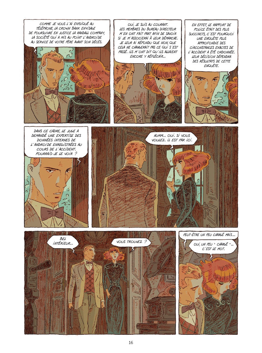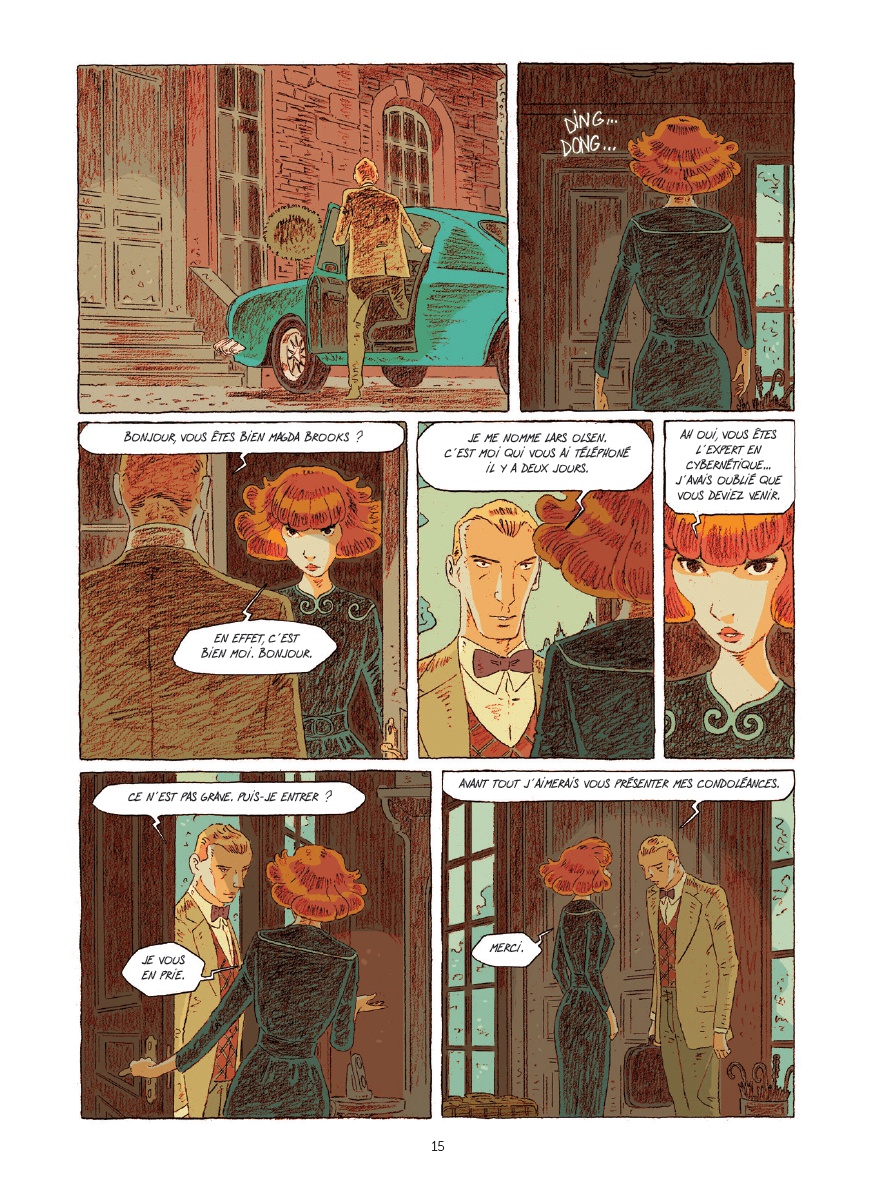 Chaque nouvelle parution de l’auteur d’Amorostasia est l’occasion de questionner sur la teneur des rapports humains. Ici, Magda se retrouve face à un robot qui, progressivement, sort des sentiers balisés de la cybernétique… Ce face-à-face, maintes fois traité, trouve ici un développement des plus personnels, puisqu’il permet aux deux protagonistes d’explorer de nouveaux territoires ou d’en redécouvrir d’anciens, oubliés. Ce faisant, un grand nombre de thèmes sont abordés, allant du deuil à la relativité générale d’Einstein, en passant par le vol d'un papillon, l’appréhension de soi (et des autres) ou la responsabilité pénale d’une machine… Autant de concepts d’une richesse infinie que Cyril Bonin, dans un style élégiaque, ne fait cependant qu’effleurer, certes avec beaucoup justesse, mais au prix de frustrantes ellipses et ce malgré une pagination riche de plus d'une centaine de planches. Graphiquement et curieusement, l’ex-élève des Arts décoratifs de Strasbourg opte pour un univers visuel proche de celui des années 50, mais qui aurait développé une science de la robotique poussée à sa toute extrémité sans aucun des abus communément admis ! Ceci lui permet toujours de cultiver un trait, si particulier et élégant dans sa retenue, servi par une palette de couleurs des plus automnales, qui baignent ce one-shot d’une luminosité étirant la temporalité du récit, Ce qui est sous-entendu devient alors aussi important que ce qui est dit.