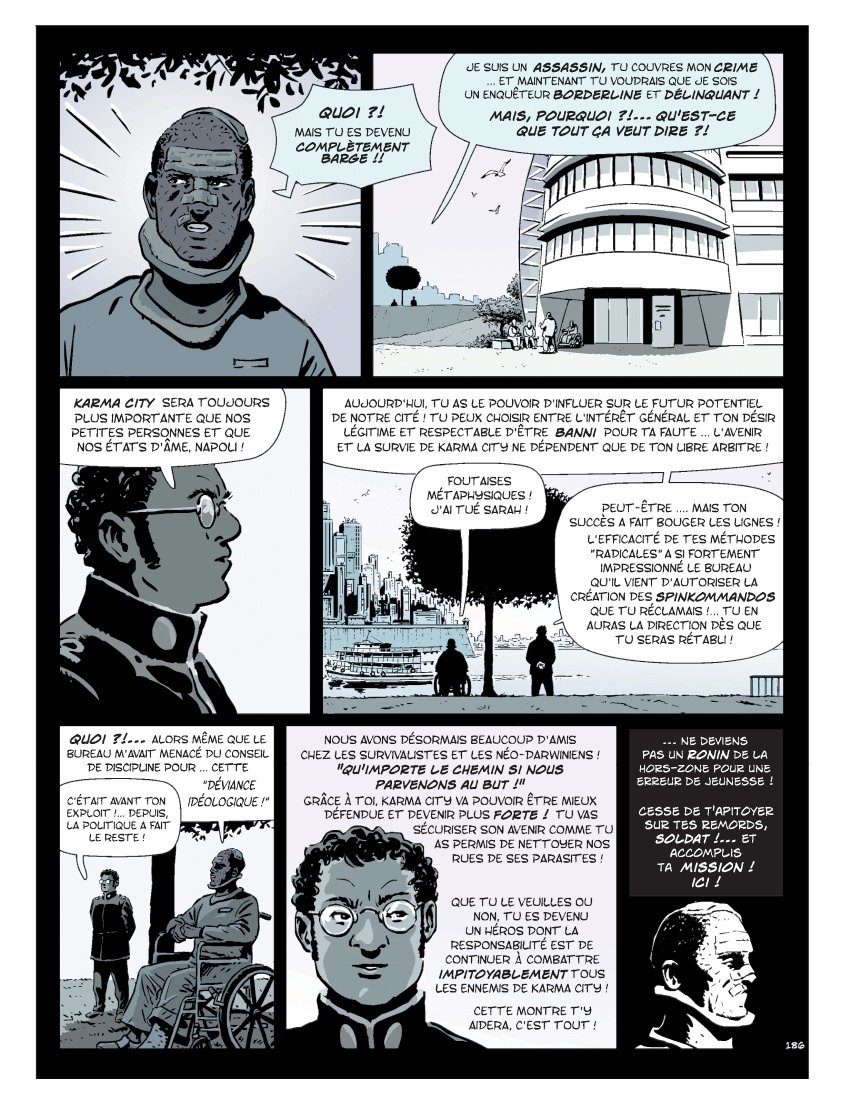 Résumé: Karma City : une ville vertueuse régie par les lois universelles du karma, où l'intérêt général primerait toujours sur l'intérêt particulier. Les agents karmiques Cooper, Asuka et Napoli ont enfin réussi à démanteler le réseau de revente d'antiquités découvert par la malheureuse Emma List. La juge Bénédicte, réputée impartiale, est responsable pour trancher cette affaire. Inexplicablement, elle prend la défense des coupables contre la Major Cooper. Alors que celle-ci la pousse dans ses retranchements, la juge décède soudainement d'un AVC. Les trois enquêteurs comprennent alors que les hautes-sphères de la société sont touchées par un complot d'une ampleur insoupçonnable. Commencent pour eux une cavale, véritable course contre la montre, où ils vont rejoindre les réseaux abandonnés de la ville pour tenter de survivre. Survivre et surtout démanteler cette mystérieuse organisation qui semble en vouloir au libre-arbitre humain. Heureusement, depuis toujours les Alchimistes prévoient une autre voie, un autre chemin, réfléchissant avec Zuber, une I.A. consciente, à l'avenir possible de l'Humanité entière. Mais à vouloir accorder trop de puissance à une machine en lui donnant la connaissance d'elle-même, qui devient le maître et qui se transforme en esclave ?