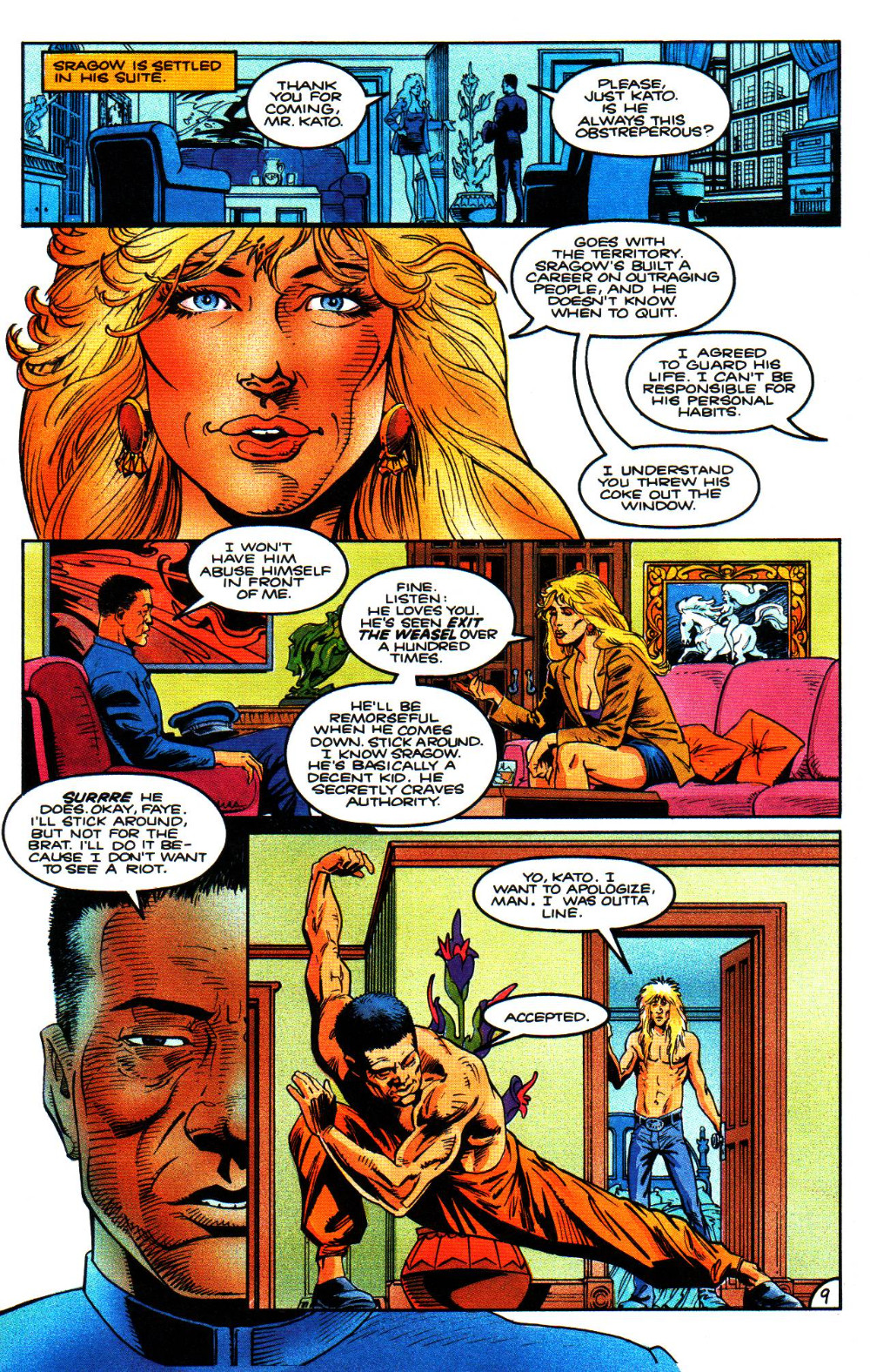 Résumé: Rock star Sandy Sragow (professionally known simply as Sragow) is almost murdered on stage during a Boston concert, and his tour's next stop is The City. Due to his connection to Reid Communications and his having played in some sessions produced by the involved record label's president, concert pianist Paul Reid (a.k.a. Green Hornet IV) is asked by the mayor what he might be able to offer in security arrangements. As the would-be killer used Asian martial arts weaponry and the star is a buff, Paul asks Hayashi Kato to help. The obvious suspects are the Spitting Cobras, a street gang Sragow anatgonized by firing two of its members from his entourage, and Ned Karthage, the ex-business partner and former lover of his label's president, Faye Ripien. At the City's airport, Kato meets the rocker, who recognizes him from his kung fu movies and demotes his regular bodyguard, Rex, to driver. Sragow's profanity, drug abuse, promiscuity and arrogance do not sit well with Hayashi. Five Cobras accost the two while working out at a dojo, but are easily handled. However, while Sragow later entertains two playmates in his high rise hotel suite, an arrow smashes through the window and kills one of the women. During his concert, a man in the shadows lets loose an arrow from a compound bow....