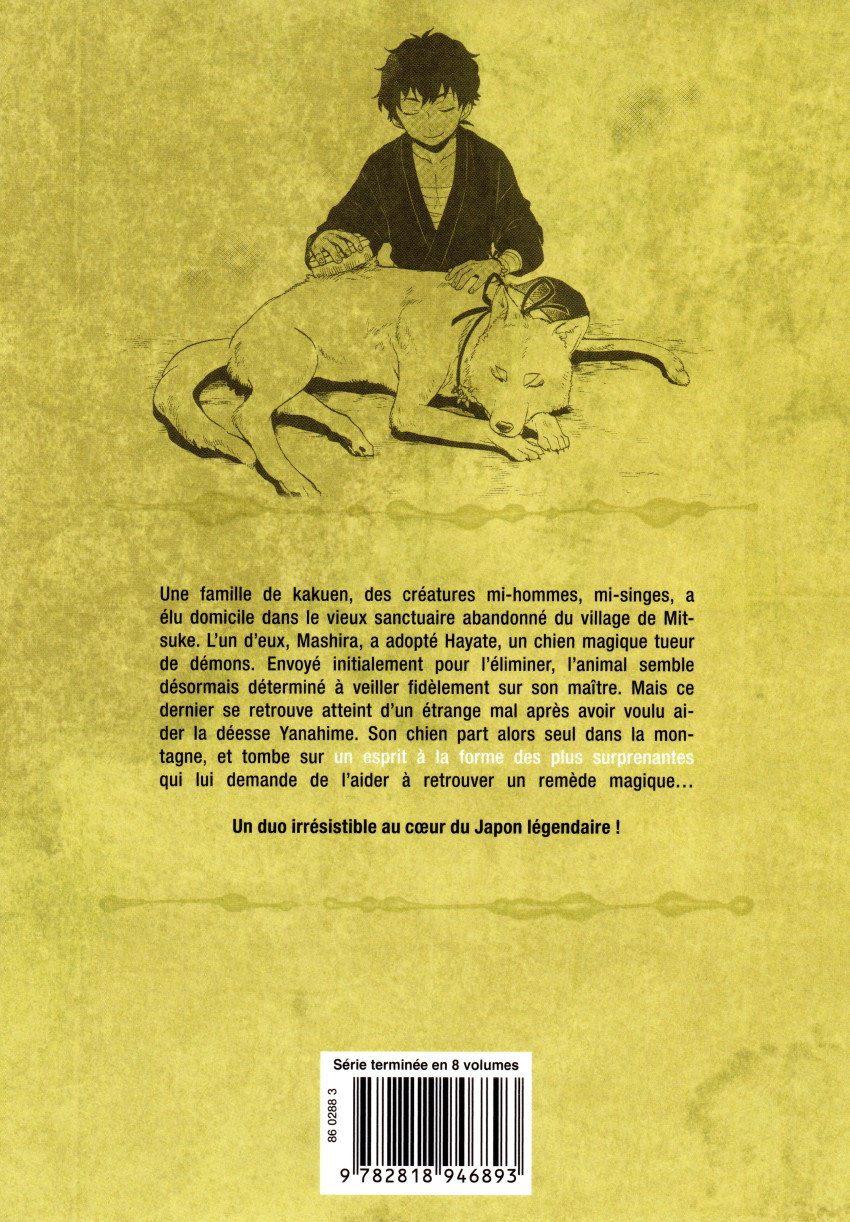 Résumé: Une famille de kakuen, des créatures mi-hommes, mi-singes, a élu domicile dans le vieux sanctuaire abandonné au village de Mitsuke. L'un d'eux, Mashira, a adopté Hayate, un chien magique tueur de démons. Envoyé initialement pour l'éliminer, l'animal semble désormais déterminé à veiller fidèlement sur son maître. Mais ce dernier se retrouve atteint d'un étrange mal après avoir voulu aider la déesse Yanahime. Son chien part alors seul dans la montagne, et tombe sur un esprit à la forme des plus surprenantes qui lui demande de l'aider à retrouver un remède magique...
