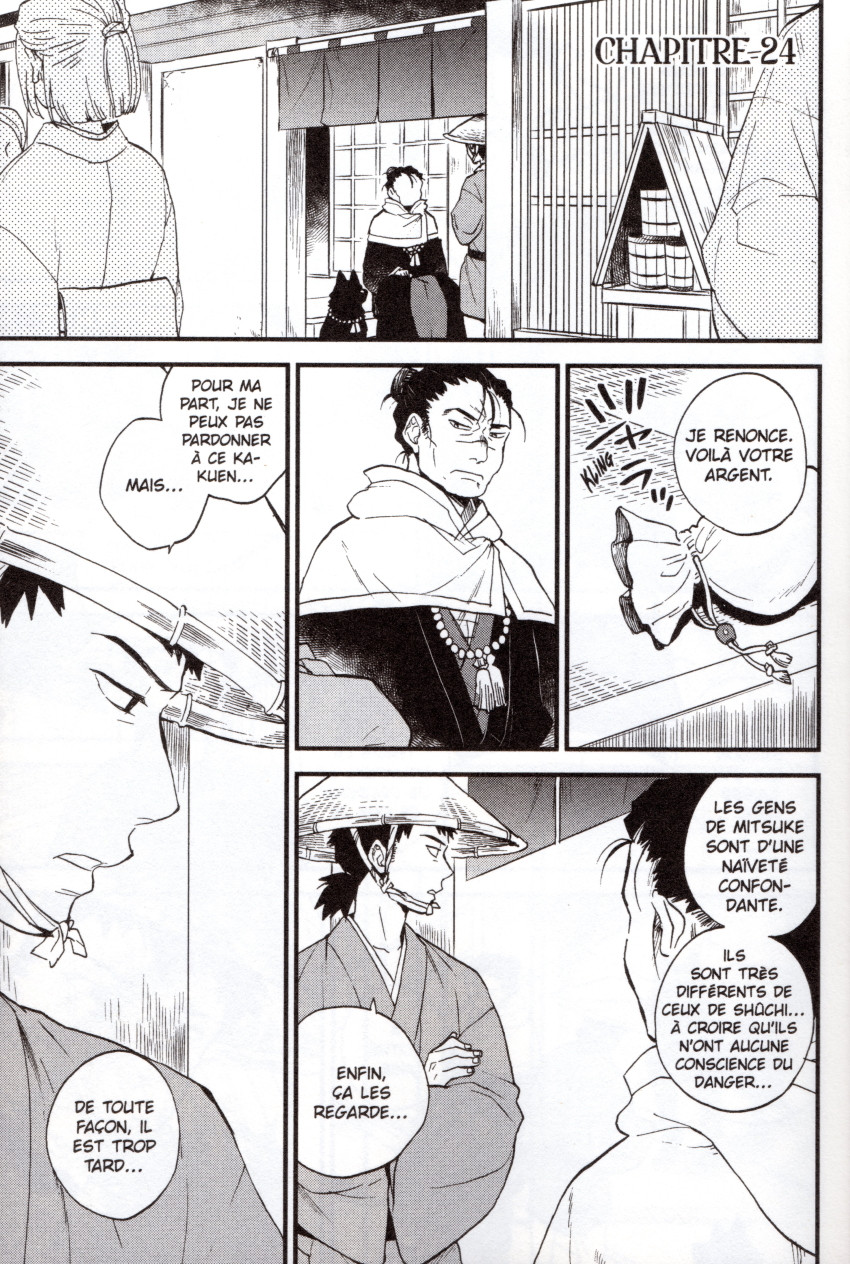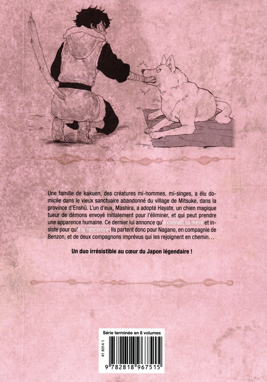 Résumé: Une famille de kakuen, des créatures mi-hommes, mi-singes, a élu domicile dans le vieux sanctuaire abandonné du village de Mitsuke, dans la province d'Enshû. L'un d'eux, Mashira, a adopté Hayate, un chien magique tueur de démons envoyé initialement pour l'éliminer, et qui peut prendre une apparence humaine. Ce dernier lui annone qu'il connaît sa mère et insiste pour qu'il l'a rencontre. Ils partent donc pour Nagano, en compagnie de Benzon, et de deux compagnons imprévus qui les rejoignent en chemin...