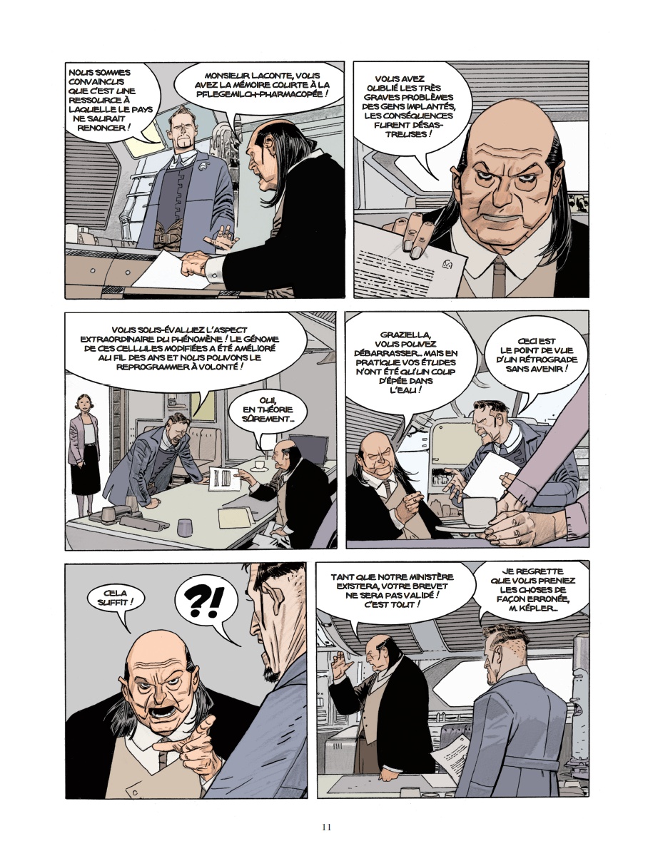 Le sympa envoi de l’éditeur Mosquito, grand défricheur des talents graphiques italiens et d’ailleurs, me permet de découvrir l’artiste Corrado Mastantuono, dont la couverture de l’album Klon est particulièrement réussie: énigmatique, dynamique et colorée. Il a publié récemment en France la série fantasy Elias le Maudit qui a plutôt de bonnes critiques et préalablement des albums de genre proches de la BD américaine des années 50. Son style est assez classique et j’avoue que si les couleurs de l’album sont très sympa, les images que l’on peut voir de ses autres séries, notamment western et polar montrent que c’est probablement en noir et blanc qu’il faut apprécier son talent. Le design général de l’album (qui est de la SF dystopique) est plutôt rétro, rappelant les BD SF des années 70-80, avec un petit côté Gillon/Moebius/Manara: une simplicité du trait, une certaine statique des mouvements en même temps qu’une grande précision anatomique et d’occupation de l’espace. Mastantuono a commencé dans l’animation et a travaillé chez Disney, et cela se voit dans cette maîtrise générale des cases. Dans un futur proche, les multinationales imposent leurs vues de gré ou de force aux gouvernements. Le ministre de la santé italien est pourtant un incorruptible. Chargé d’installer un nouveau système de sécurité imparable au ministère, l’anarchiste punk Rocco Basile assiste à une tentative d’assassinat et devient la cible d’une officine qui le pourchasse sans relâche. Mais pour ce nihiliste passablement shooté, la réalité n’est pas ce qu’elle semble être… L’intrigue de Klon est un peu perturbante par sa linéarité et par les effets de brouille que provoquent les sauts de réalité: le lecteur, comme le personnage, ne sait pas tout au long de l’album à quel saint se vouer, ce qui est réel et ce qui est rêvé, le pourquoi de cette fuite sans fin… L’histoire est très directement issue de l’univers de Philip K. Dick, teintée du pessimisme politique italien d’une société gangrenée par la corruption, l’affairisme et les mafia. C’est donc bien une BD d’une grande originalité que nous propose Mosquito, à la fois par ses thèmes et par son dessinateur, à peu près inconnu de ce côté ci des Alpes. Il plane une drôle d’atmosphère dans cet album qui débute par un long monologue du personnage principal commentant la société et ses contemporains tel un sage que les drogues auraient rendu extralucide. L’auteur affuble son héros d’une coiffure digne de Ziggy Stardust, d’un cache poussière sorti d’un Sergio Leone et de cernes qui ne le rendent pas franchement sympathique… Surtout, sa passivité chronique en font plus un témoin d’une machination infernale qu’un crack de l’informatique qu’il est censé être. Comme souvent dans les histoires conspirationnistes le scénario malmène ses marionnettes et son lecteur avec. C’est un peu frustrant car si des coups de théâtre surviennent dans cette course effrénée de 130 pages, ils ne reposent jamais sur des décisions du héros. Finalement cela correspond bien à la psychologie du personnage, extérieur à son environnement et à son existence, c’est cohérent avec l’intrigue, mais je trouve qu’il manque une petite étincelle pour véritablement immerger le lecteur. La chute de l’histoire est néanmoins bien menée et terriblement cynique. Graphiquement Mastantuono maîtrise sa partition et le style du dessin respire une certaine classe. J’ai eu un peu de mal néanmoins avec le design général de ce futur qui fait un peu daté. C’est une histoire de goût, là encore on sort des styles hyper-technologiques courants dans la BD de SF pour une apparence Old-school vue chez Moebius par exemple (j’ai retrouvé quelques ambiances de la regrettée série L’histoire de Siloé de Servain et Letendre). Au final nous avons une bonne histoire de SF paranoïaque assez classique qui permet de découvrir le travail d’un auteur au grand potentiel. Ce n’est pas la BD de la décennie mais un travail honnête pour des lecteurs curieux de découvrir la BD italienne. A lire sur le blog: https://etagereimaginaire.wordpress.com/2018/05/01/klon/BDGest 2014 - Tous droits réservés