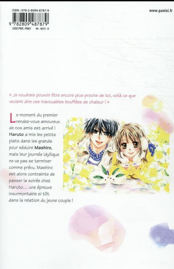 Résumé: C'est le coeur battant que Mashiro se prépare pour son premier rendez-vous avec Haruto. Le jour J, le jeune homme a mis les petits plats dans les grands, et offre un moment exceptionnel à sa petite amie. Cependant, tandis qu'ils sont sur le chemin du retour une intempérie empêche Mashiro de continuer jusqu'à chez elle, la jeune fille doit donc dormir chez Haruto et sa facétieuse famille ! Plus proches que jamais, les jeunes gens sont confiants dans un avenir qu'ils imaginent radieux. Mais c'est sans compter l'arrivée de Tôta, un ami d'enfance amoureux transi de Mashiro qui entend bien évincer toute concurrence ! Les amateurs de shojo ne tarissent pas d'éloges sur ce titre plein de tendresse. Les commentaires et reviews le qualifient de « rafraîchissant et mignon ». Les lecteurs en apprécient la légèreté et l'humour, et la douceur habituelle du trait de Ai Minase est souvent mise en avant.
