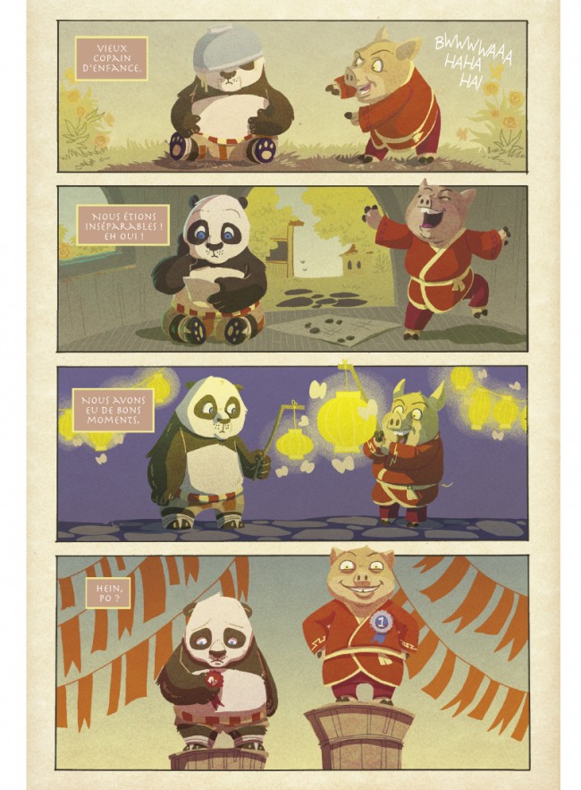 Résumé: Les aventures en BD de Po, le Kung Fu Panda ! Tout se complique pour Po ! Il doit à la fois participer au grand tournoi darts martiaux organisé dans la vallée mais également être jury du célèbre concours culinaire de la région. Quel dilemme ! Mais à coup sûr, il va trouver une solution pour assouvir sa soif de bagarre ainsi que son féroce appétit. Une nouvelle histoire inédite à lombre de la muraille de Chine.