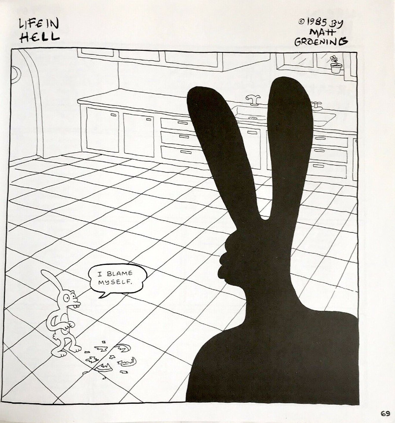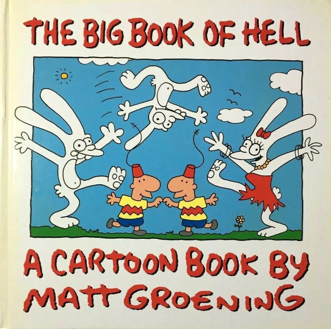 Painstakingly assembled and rigorously organized by that master of clutter, Matt Groening, this is not another mini-jumbo, hard-to-read, abreviated compendium in that seemingly endless series of discourses on hell bu a gargantuan historical extravaganza of ten years’ worth of the ever-popular Life in Hell cartoon strip, which looks uncannily like The Simpsons if you keep your eyes closed and have a sufficiently fertile imagination.