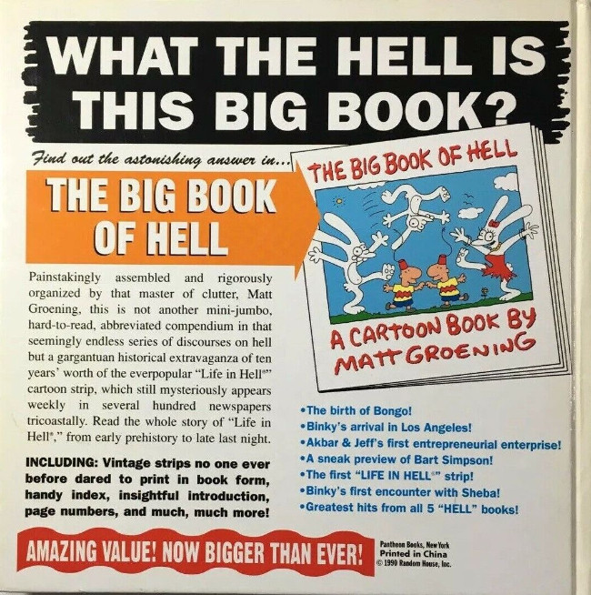 Includes: The birth of Bongo! Binky’s arrival in Los Angeles! Akbar and Jeff’s first entrepreneurial enterprise! A sneak preview of Bart Simpson! The first Life in Hell strip! Binky’s first encounter with Sheba! Greatest hits from the first five Hell books!