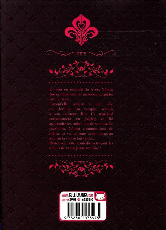 Nous avons droit à un shojo très léger où une jeune lycéenne se fait mordre par un vampire qui va devenir son maître en lui enseignant l'art du vampirisme. Bref, tout un programme ! Visiblement, elle semble bien aimer le sang des jeunes camarades de classe, ce qui donne lieu à certains fantasmes, car le suceur et sa victime sont hyper stimulés sexuellement. J'avoue ne pas avoir trop goûté à cette sauce rouge. La scène sans doute la plus pathétique est celle du vampire qui adore le jogging, qu'il considère comme le textile le plus avenant au point d'en offrir un à notre jolie héroïne. Il faut dire que ce manga semble jouer sur les stéréotypes liés au vampire, comme la crainte du soleil ou de l'ail, ou encore l'invisibilité face à un miroir. Au niveau du graphisme, c'est plutôt soigné et bien dessiné notamment pour les personnages. Je vais être plutôt très indulgent dans ma notation, car c'est agréable à lire et on passe un bon moment au milieu de toutes ces pointes d'humour. Certes, il faut se mettre en condition. Ce manga en 3 volumes semble apporter un nouveau souffle au genre en mêlant humour et romance. Ne pas confondre cette nouvelle série avec My Lady Vampire, car cela n'a rien de commun, mis à part sans doute le sujet.BDGest 2014 - Tous droits réservés