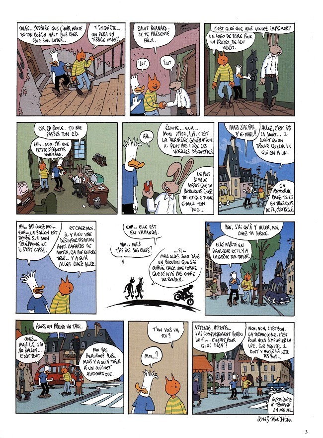 Très semblable au deuxième tome, sauf que cette fois, on est avec des personnages de Lapinot à 100 %. Surtout Patrick et Félix, en fait. L'histoire se concentre surtout sur les jeux vidéo et l'informatique de son époque (2001) : il est certain que les références ont vieilli. La grosse différence entre ces albums et les Lapinot avec Lapinot, pour moi, réside dans le fait qu'ici c'est surtout l'auteur qui nous fait part de ses craintes sur la société contemporaine -- plutôt que de nous présenter une histoire propre à cet univers. Chaque page fait un gag, et certaines idées s'échelonnent sur quelques pages. Mais, bof. Plusieurs gags se terminent de la même manière (wôhhh, l'autre), et il y a une certaine répétition qui dénote un manque d'originalité. Même le dernier gag de l'album est prévisible et manque tellement d'éclat qu'on a de la difficulté à croire que ça se termine là-dessus. Je trouve ça très drôle, aussi, que Trondheim écrive Tetris avec un accent aigu (Tétris), alors que Pokémon sans accent (Pokemon)! Il y a aussi cette conversation à la page 38 : - Peut-être la décennie idéale était-elle celle de 1960? La croissance mais pas de maladie, pas de guerre... - La liberté d'expression muselée. La liberté d'expression était-elle muselée en 1960? Je me demande vraiment ce que Trondheim pense de notre liberté d'expression aujourd'hui en 2023. C'est sûr qu'en 2001, c'était plus libre qu'aujourd'hui en tout cas!Le 08/05/2018 à 22:58:30