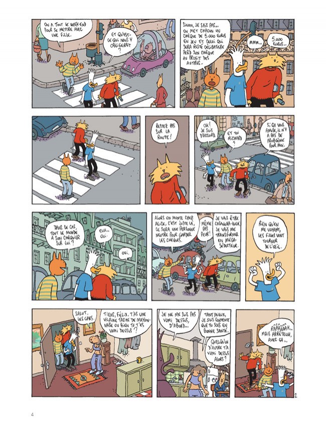 C'est avec le plus grand plaisir qu'on reprend contact avec cette attachante bande de potes. Et pourtant je n'ai pas pu m'empêcher d'être légèrement déçu. Et j'ai le sentiment que ça vient en partit des personnages. Tout d'abord l'absence de Lapinot dont les dialogues rationnels, moraux et fatalistes manquent comme contre-poids à ceux des autres protagonistes. Ensuite Richard, le génial Richard qui faisait toute la saveur de la série, est ici comme anesthésié, moins drôle, moins épicurien, plus réfléchit, plus mûr, et là on perd une véritable pépite. Félix et Patrick sont quant à eux assez fades, mais ça change pas vraiment d'avant (quoi que Félix était quand même assez marrant comme double de Richard). Reste néanmoins Vincent, obsessionnel compulsif des microbes et des bactéries, assez amusant dans sa froideur et son comportement anormal, mais dont le ressort comique peut devenir parfois assez répétitif. Au niveau du scénario lui-même ça m'a également semblé moins bon, les scènes n'ont plus vraiment cette saveur qu'elles avaient avant, ça s'enchaîne peut-être de façon trop logique, je n'sais pas. En tout cas on rit moins, il y a toujours des gags amusants mais ça m'a semblé moins drôle que les autres tomes.