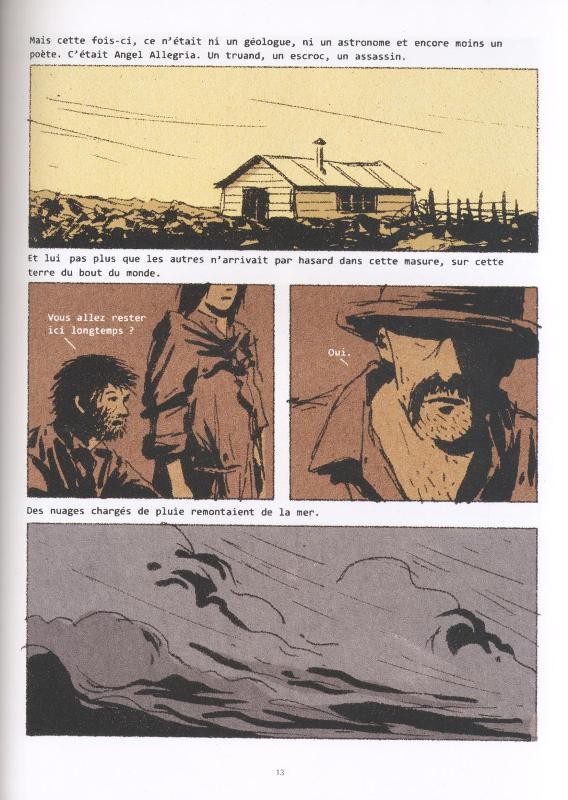 Contemplatif est l’adjectif le plus évident pour décrire cet album aux superbes panoramas et à l’action limitée. Le traitement des cases, de la nature omniprésente, ainsi que la douceur des camaïeux de couleurs brun/beige et noir/bleu, en font un livre enchanteur. Le lecteur ne peut que se plonger dans ces contrées lointaines et rêver d’évasion. La vie triste et dure de Paolo devient un prétexte pour conduire son regard vers la sobriété des paysages et la simplicité poussée à son paroxysme. Le travail graphique, très personnel, évoque les dessins aux pochoirs où les formes naissent par contraste entre le fond monochrome et le noir de la silhouette. L’émotion est véhiculée avec finesse et sans artifice. L’adéquation est parfaite avec la nature âpre de l’extrême Sud du Chili.