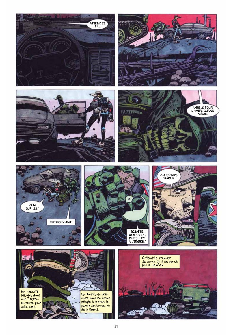 Album qui a plus de 25 ans, mais pas si ringard que ça, sur un thème qui est toujours d'actualité ! Le graphisme atypique, un peu sombre, colle très bien à l'ambiance de l'ouvrage. Les personnages futuristes restent encore réalistes en 2018 (cf. les robots). On sent que le scénario a été travaillé. Achevé en 4 chapitres. Je m'attendais à quelque chose de plus bourrin (cf. la couverture), avec un gros musclé et sa casquette américaine vissée sur la tête. Il n'en est rien, c'est une dentelle réalisée par des doigts de bûcherons ! J'apprécie de plus en plus ces "one-shot" bien construits, qui permettent de lire une bonne fable en une bonne heure, sans devoir courir après la suite : confort psychologique (mais que va-t-il encore se passer ?), confort matériel (place...) et financier (puits sans fond, ces "très bonnes séries" : des excellentes affaires pour les éditeurs). On se fait donc ici plaisir : on lit son comic et on passe à autre chose en ayant développé son esprit critique sur les courses à l'armement et la suprématie US sur le monde. L'édition est très belle. La couverture bien cartonnée comme on aime en Europe et les pages sont très épaisses. Gros confort de lecture. :ok: Pour ne rien gâcher, la couverture est très belle. Critère important pour moi. Apprécié et recommandé. -- Complète parfaitement un comic comme Hard Boiled dans sa bibliothèque. --BDGest 2014 - Tous droits réservés