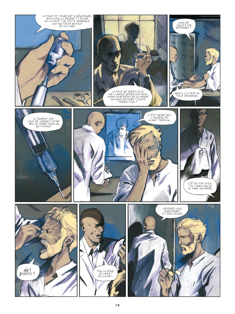 Pour rendre cette épopée implacable, Xavier Coste sort le grand jeu. Le trait acéré et réaliste passe à un expressionnisme inquiétant dès que la nuit tombe et glisse même dans l’abstraction quand l’esprit capitule, écrasé par des forces inconnues. Heureusement, le résultat reste d’une parfaite clarté. En effet, le dessinateur ne s’égare jamais dans des métaphores graphiques trop audacieuses. Les planches collent à la narration et, après le cauchemar, la navigation reprend, la barre fermement fixée vers sa destination. Les amateurs des travaux d’Enki Bilal (période Animal’z/La couleur de l’air) et de ceux de Mathieu Bablet (Shangri-La) devraient se retrouver dans ces pages.