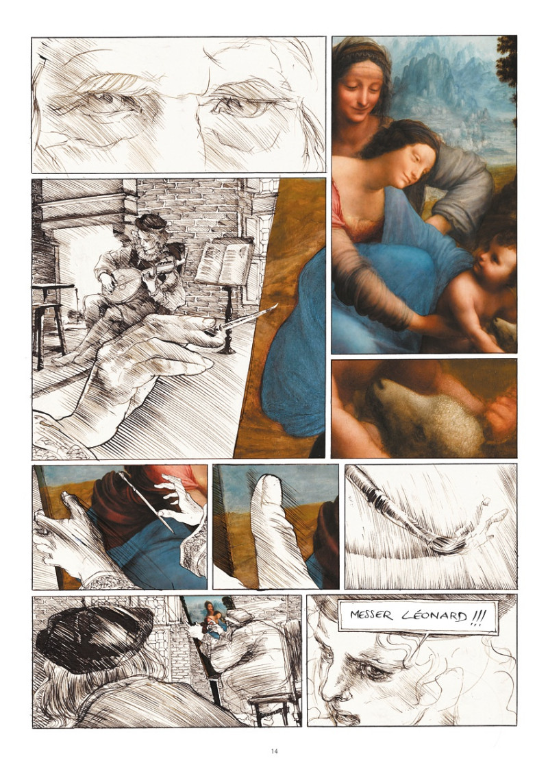 Stéphane Levallois fait de l’œuvre du maître son matériau. Il s’approprie ses croquis, ses dessins et ses peintures, les déconstruit, puis les refaçonne pour les mettre à son service. Il les dénature, les altère et les corrompt, sans pour cela être irrespectueux. Pour tout dire, la démarche en entier témoigne de l’immense admiration que le bédéiste voue à celui qui est décédé à Amboise, l’auteur allant même jusqu’à tracer des hachures à la façon d’un gaucher pour ainsi éviter de trahir le coup de pinceau du Toscan. L’ensemble est grandiose, l’artiste s’offre d’ailleurs le luxe de dessiner tout au plus cinq ou six cases par planche et n’hésite pas à confier une double page à une illustration qui revendique cet espace. La plupart des vignettes sont réalisées à l’encre, bien noire pour représenter le futur ou sépia pour dépeindre l’époque des Borgia. Ça et là des taches de couleur, évoquant toutes La Vierge, l'Enfant Jésus et sainte Anne apparaissent, chromatiquement et métaphoriquement, comme de petites fenêtres lumineuses éclairant une entreprise passablement sombre.