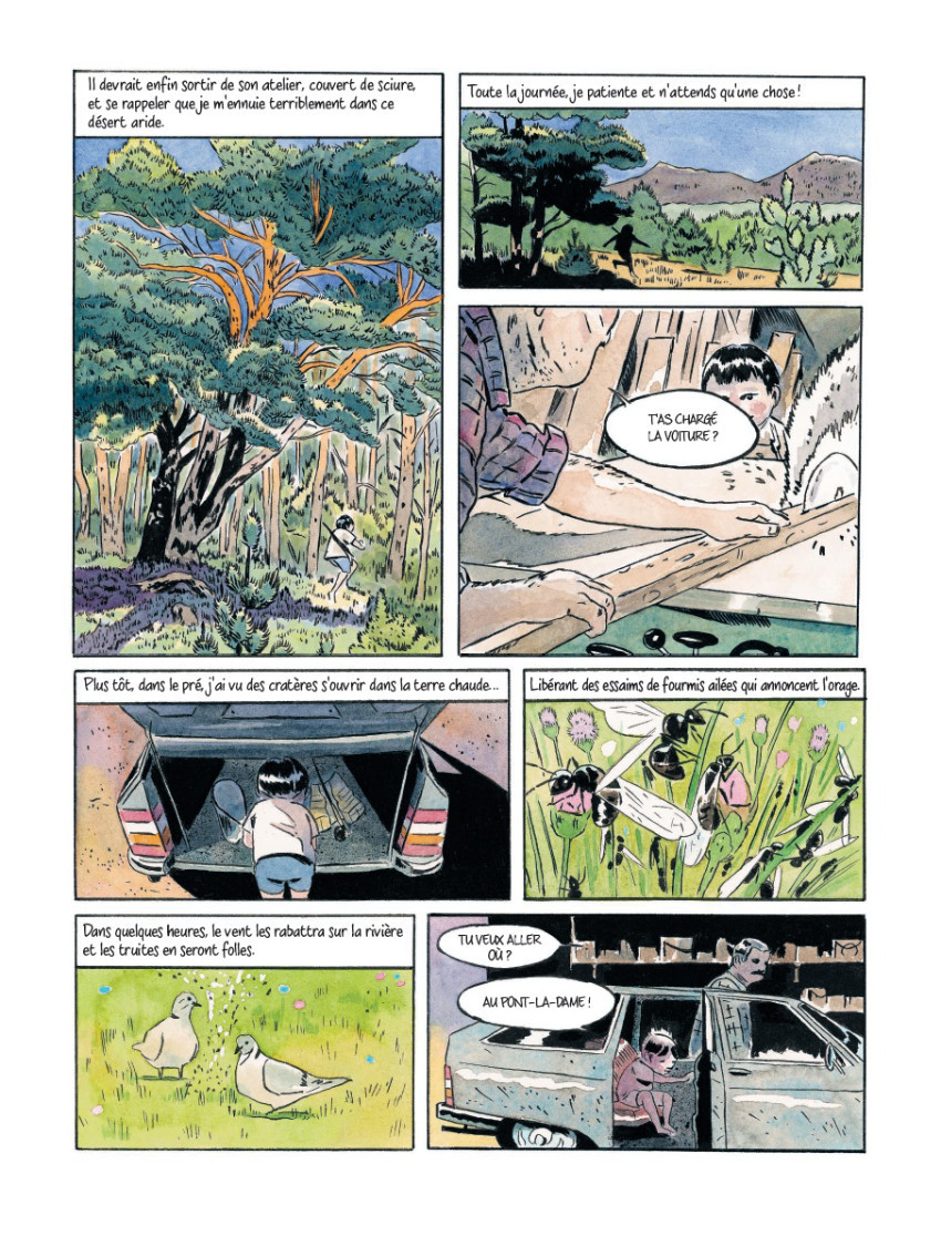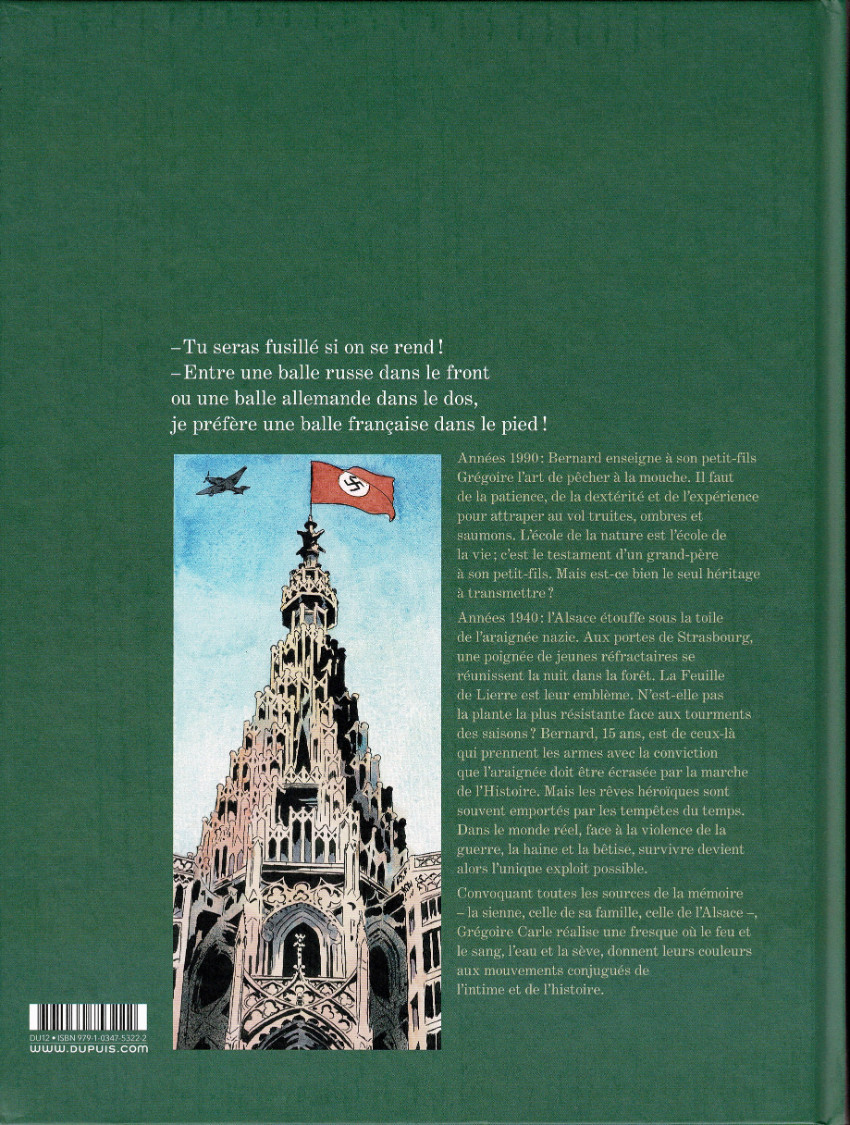 Quelle belle œuvre ! Il y a bien sûr la découverte de l'engagement d'adolescents alsaciens contre le nazisme et la main-mise allemande sur l'Alsace, leur engagement total malgré l'emprisonnement et l'enrôlement de force dans les troupes allemandes. Il y a aussi cette transmission familiale entre un grand-père et son petit-fils, On sent délicatement combien leur proximité est celle de l'apprentissage de la pêche à la mouche et pas celle du passé que le grand-père n'évoque pas. Alors pour cela, il y a ces berges du Rhin si magnifiquement dessinées par Grégoire Carlé, ces insectes qui peuplent les rivières, qui sont le trait d'union entre le grand-père et son petit-fils. Une belle œuvre de mémoire familiale et collective, une belle description d'une nature, celle des bords de la rivière, qui est un hymne et un appel à garder conscience et souvenir de l'horreur que peut produire l'homme et de la beauté de la nature.BDGest 2014 - Tous droits réservés