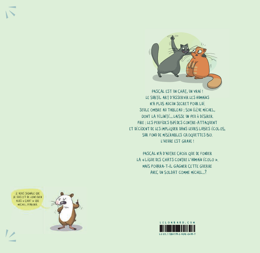 hez Bénédicte, il y a deux chats : Pascal, le matou caractériel qui vous fait bien sentir qui est le maître et Michel, la bonne pâte qui ne ferait pas de mal à une souris. En gros l’harmonie règne. Mais voilà, la mode est à la consommation responsable et une nouvelle sorte de croquette – du bio s’il vous plaît – a fait son apparition dans l'écuelle. S’en est trop pour Pascal. Ce changement unilatéral des habitudes est la goutte qui fait déborder le vase ! Il décide de créer le La Ligue des Chats Contre l’Humain Écolo, la L.L.C.H.E, afin de remettre les pendules à l’heure.