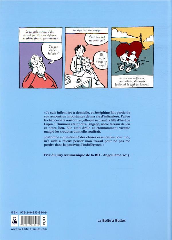 J'ai eu la chance de la rencontrer, elle, qui se disait la fille d'Arsène Lupin ! L'humour était notre langage, notre terrain de jeu et notre lien. Elle était drôle et étonnamment vivante malgré les troubles dont elle souffrait. Joséphine a questionné des choses essentielles pour moi, m'a aidée à mieux penser mon travail pour ne pas me perdre dans la passivité, l'indifférence.Par ce récit, je voudrais dire qu'il ne faut jamais capituler face à ces troubles du comportement si déstabilisants pour nous bien portants. Il faut toujours chercher le lien, la porte qui nous permet d'accéder à l'autre. Et là, on peut être prêt à se laisser bouleverser par « la demoiselle aux yeux verts ».