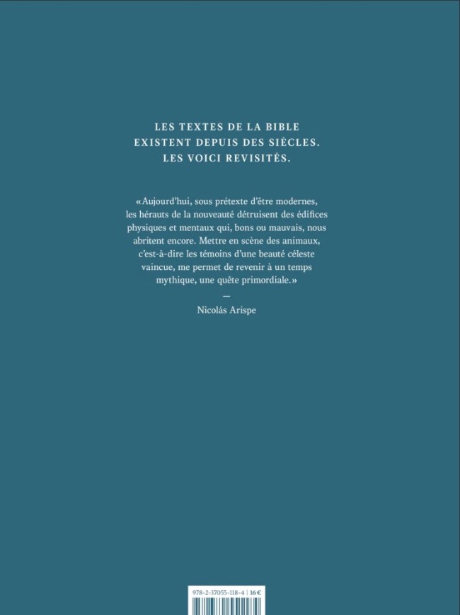 Les récits présentés dans l’album sont évidemment connus, mais dans l’univers de Nicolas Arispe, les époques se télescopent et les personnages sont des animaux (Abraham est un ours, l’Archange Michel un oiseau, Job un lézard, Ézéchiel un taureau et Jonas un loup). Bref, l’approche est singulière. Il est cependant regrettable que ces nouvelles soient réduites à quelques planches. Dix-neuf images et dix-sept phrases pour raconter l’origine de tout, c’est un peu court.