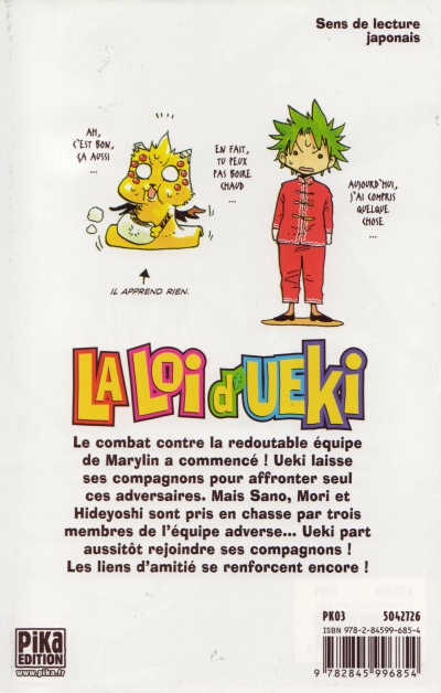 Résumé: Sano, Mori et Hideyoshi ont bien du mal face aux membres de l'équipe de Marylin. Toutefois, leur farouche volonté de s'entraider leur permet de tenir bon jusqu'à ce qu'Ueki les rejoigne. Mais comme l'affrontement s'éternise, Dieu annonce qui sont les porteurs des pendentifs à 10 points : Marylin et Mori. Le combat en équipe se transforme alors en duel, Mori est prise en chasse par Memory, Mash tâche d'empêcher Sano de rejoindre Mori... Quant à Ueki, il tente désespérément de se débarrasser de Marylin pour aller aider ses compagnons.