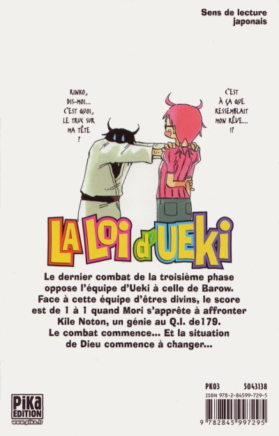 Résumé: Les duels contre les membres de l'équipe de Barow se succèdent. Suite à la défaite de Sano, Ueki doit affronter Barow, seul membre de son équipe encore conscient. Le combat s'annonce périlleux. Ueki a renoncé à ses objets divins pour parvenir au niveau deux ! De son côté, Dieu s'apprête à révéler à son fidèle assistant, la véritable motivation d'être du tournoi...