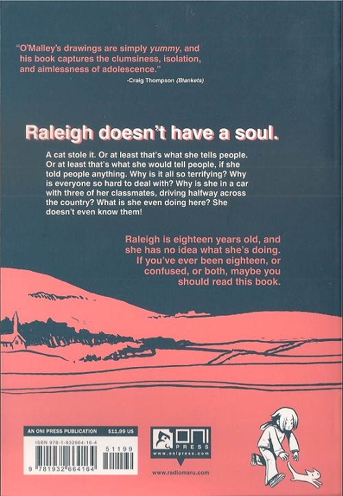 Résumé: Raleigh doesn't have a soul. A cat stole it - at least that's what she tells people - at least that's what she would tell people if she told people anything. But that would mean talking to people, and the mere thought of social interaction is terrifying. How did such a shy teenage girl end up in a car with three of her hooligan classmates on a cross-country road trip? Being forced to interact with kids her own age is a new and alarming proposition for Raleigh, but maybe it's just what she needs - or maybe it can help her find what she needs - or maybe it can help her to realize that what she needs has been with her all along. This special hardcover edition of Bryan Lee O'Malley's classic coming-of-age graphic novel includes previously uncollected shorts and extra bonus material.
