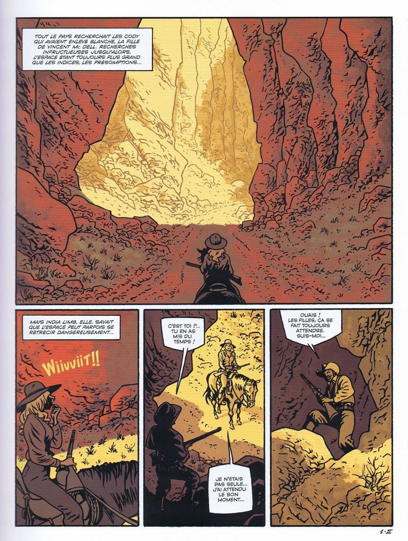 Ce second tome se situe dans la droite ligne du précédent. Jean Dufaux propose un récit classique, un drame shakespearien sur fond de western. Ce cadre sert habilement le propos. En effet, dans une société naissante qui se bâtit sur la violence, l’extermination des premiers habitants et le droit de posséder des armes, que pèsent les êtres parlant de respect, d’égalité, de tolérance et de modération ? Comme l’évoque Blanche, « il y eut un coup de feu tiré par Loup de pluie et ce coup de feu suffit à ce que les fous et les égarés sortent de l’ombre ». La fin est inéluctable mais peu importe, ce qui compte, c’est le destin des personnages, les choix qu’ils font et les fragments d’humanité qui surgissent dans ce flot de haine et d’absurdité. Rythmée par l’enchaînement des drames et la profondeur des protagonistes, agrémentée par la magie des légendes indiennes, la mise en scène s’avère intelligente et dynamique.