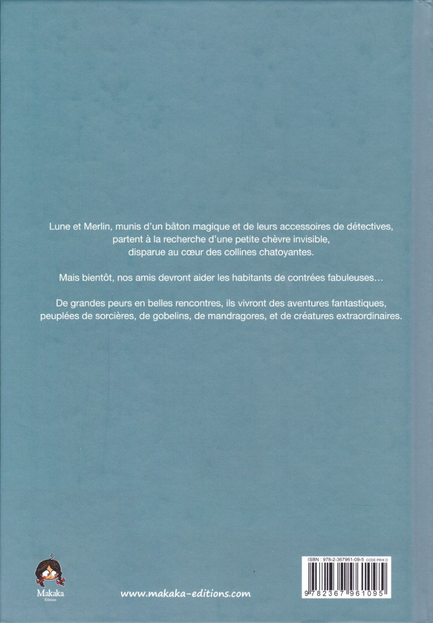 Résumé: Lune et Merlin, parés d’un bâton magique et de leur apparat de détectives, partent à la recherche d’une petite chèvre invisible, disparue au cœur des collines chatoyantes. Mais bientôt, nos amis devront aider les habitants de contrées fabuleuses… De grandes peurs en belles rencontres, ils vivront des aventures fantastiques, peuplées de sorcières, de gobelins, de mandragores, et de créatures extraordinaires.