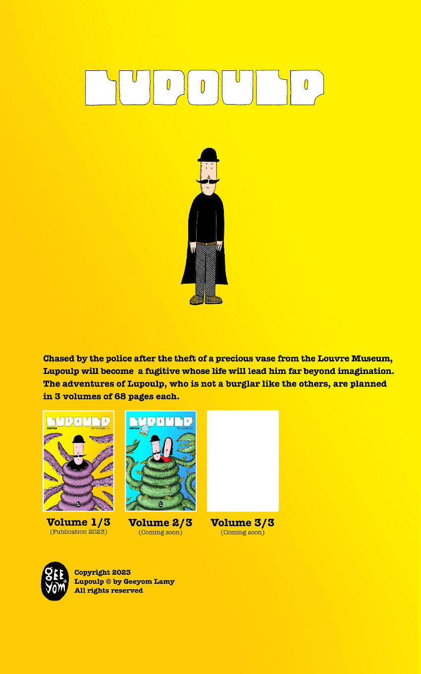 Résumé: Chased by the police after the theft of a precious vase from the Louvre Museum, Lupoulp will become a fugitive whose life will lead him far beyond imagination. The adventures of Lupoulp, who is not a burglar like the others, are planned in 3 volumes of 78 pages each.