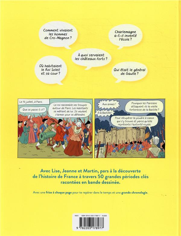 Résumé: Grâce à trois jeunes héros qui voyagent dans le temps et s'interrogent sur ce qu'ils voient, découvrir l'histoire de France devient un jeu d'enfants ! De Néandertal à aujourd'hui, en passant par les croisades, Jeanne d'Arc, la Renaissance et les deux Guerres mondiales, un ouvrage qui se veut exhaustif et accessible aux plus jeunes. Chacune des 50 périodes est traitée en une double page pour un éclairage simple et rapide, et une chronologie en bas de page reprend tous les événements importants.