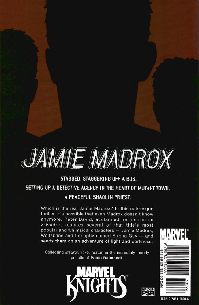 Résumé: Jamie Madrox, stabbed, staggering off a bus. Jamie Madrox, setting up a detective agency in the heart of Mutant Town. Jamie Madrox, a peaceful Shaolin priest. Which is the real Jamie Madrox? In this noir-esque thriller of a limited series, it's possible that even Madrox doesn't know anymore.