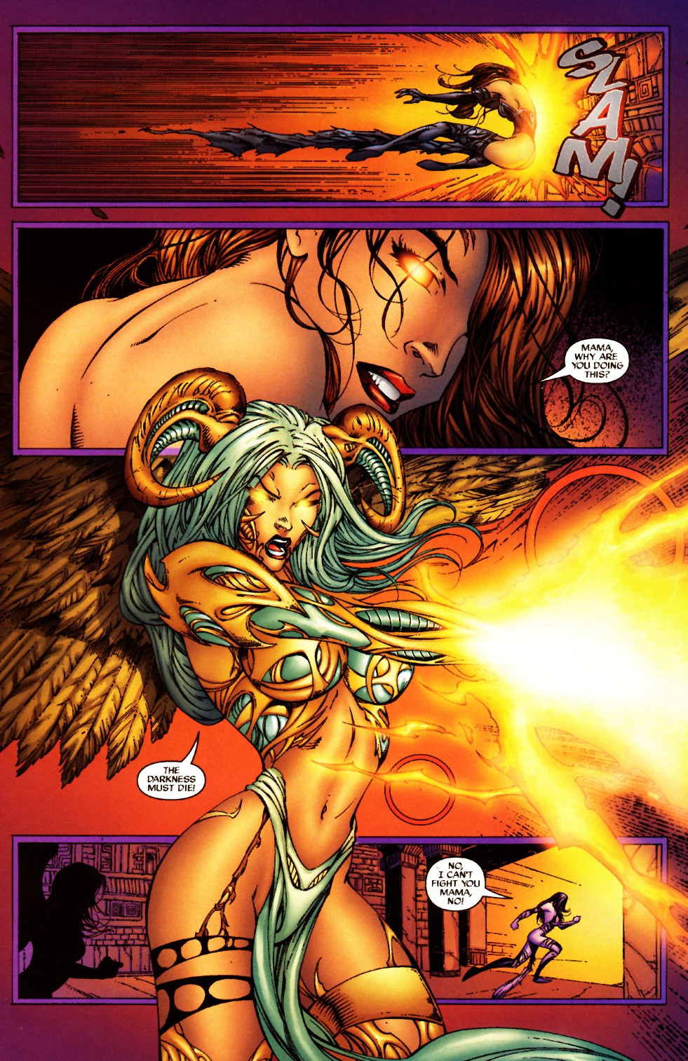 Résumé: The Magdalena is sent deep into the heart of the Amazon jungle to the hiding place of the fabled Spear of Destiny. She battles the Angelus who inhabits the temple and protects the Spear. The human daughter of the Angelus uses the Spear to infuse herself with the power of the Darkness and defeats Magdalena. The Angelus, however, cannot abide her daughter's dark power and drives her off.
