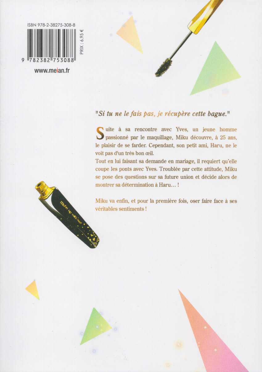 Résumé: "Si tu ne le fais pas, je récupère cette bague".Suite à sa rencontre avec Yves, un jeune homme passionné par le maquillage, Miku découvre, à 25 ans, le plaisir de se farder. Cependant, son petit ami, Haru, ne le voit pas d'un très bon oeil.Tout en lui faisant sa demande en mariage, il requiert qu'elle coupe les ponts avec Yves. Troublée par cette attitude, Miku se pose des questions sur sa future union et décide alors de montrer sa détermination à Haru... !Miku va enfin, et pour la première fois, oser faire face à ses véritables sentiments !