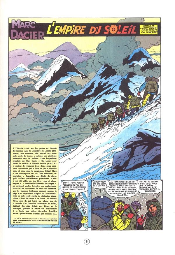 Une histoire en deux parties, avec le début dans la première et la fin dans la seconde. L’empire du soleil est le 7ème album de la série et pour Charlier la fin de la période (Marc) Dacier d’essai. Faut dire que le scénariste connait la musique. Nous tenir en haleine avec une expédition en altitude après celles de Tintin au Tibet et au Temple du soleil relève de la gageure aussi perdue d’avance que le retour en grâce de Malotru auprès de Marie-Jeanne dans la saison 5. Dommage qu’il ait oublié de nous introduire les membres de l’expédition. C’était la moindre des choses pour faire copain copain avec, dans cette aventure bien virile. Malgré tout, on tourne les pages fiévreusement les unes après les autres, de la droite vers la gauche, se demandant qu’est-ce que le petit reporter va bien encore pouvoir se prendre sur le coin de la gueule pour voir là-haut si il y est. Comme dit le proverbe : à récitatifs bâclés, suspens assuré ! Faut avouer que je n’en ai pas lu un seul, pressé que j’étais de savoir si oui ou non. Détail poilant, Dacier qui se rase entre la case 2 et la case 3 de la page 10. Belle preuve d’excentricité par les temps qui courent. Dommage qu’arrivés à destination, ils (l’expédition) ne soient pas accueillis par une bonne tarzanade polaire plutôt qu’une bande de sosies de Jean-François Copé, étirés et basanés pour manquer de finir grillés en haut d’une pyramide Maya devant une vulgaire poêle, à steaks en l'occurence. En or massif, soit dit en passant. D’ailleurs le tremblement de terre final dont sont victimes les incas, ressemble à s’y méprendre à celui des Républicains il y a un an à peine. Ah, il était fort ce Charlier !BDGest 2014 - Tous droits réservés