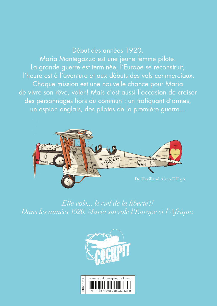 Résumé: Début des années 1920, Maria Mantegazza est une jeune femme pilote. La grande guerre est terminée, l'Europe se reconstruit, l'heure est à l'aventure et aux débuts des vols commerciaux. Chaque mission est une nouvelle chance pour Maria de vivre son rêve, voler ! Mais c'est aussi l'occasion de croiser des personnages hors du commun : un trafiquant d'armes, un espion anglais, des pilotes de la première guerre...