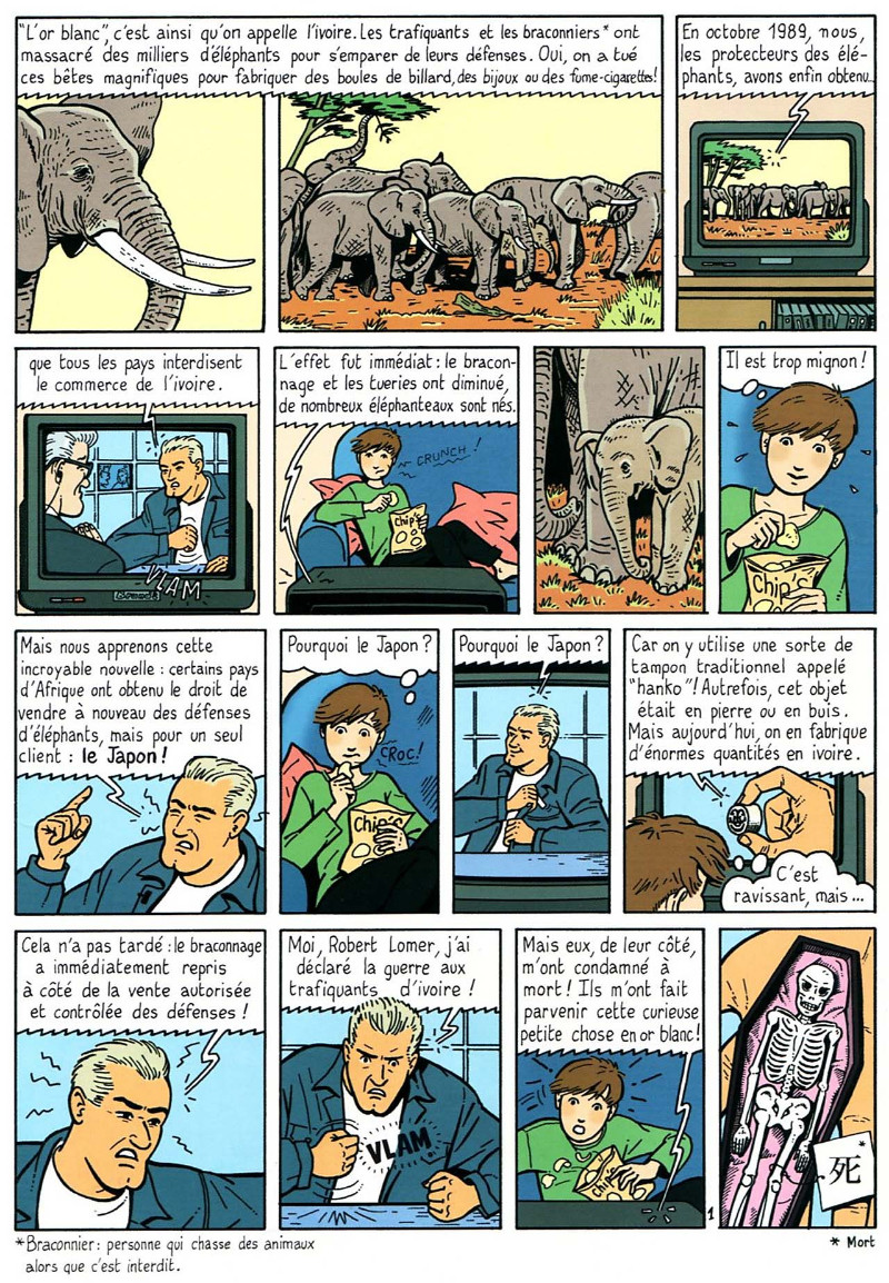 Yvan Pommaux nous emmène en Afrique sur la piste de trafiquants d'ivoire. L'histoire est adaptée à un jeune public ; le dessin de Philippe Masson n'est pas des plus jolis mais plus en harmonie avec le ton général de l'album que précédemment.