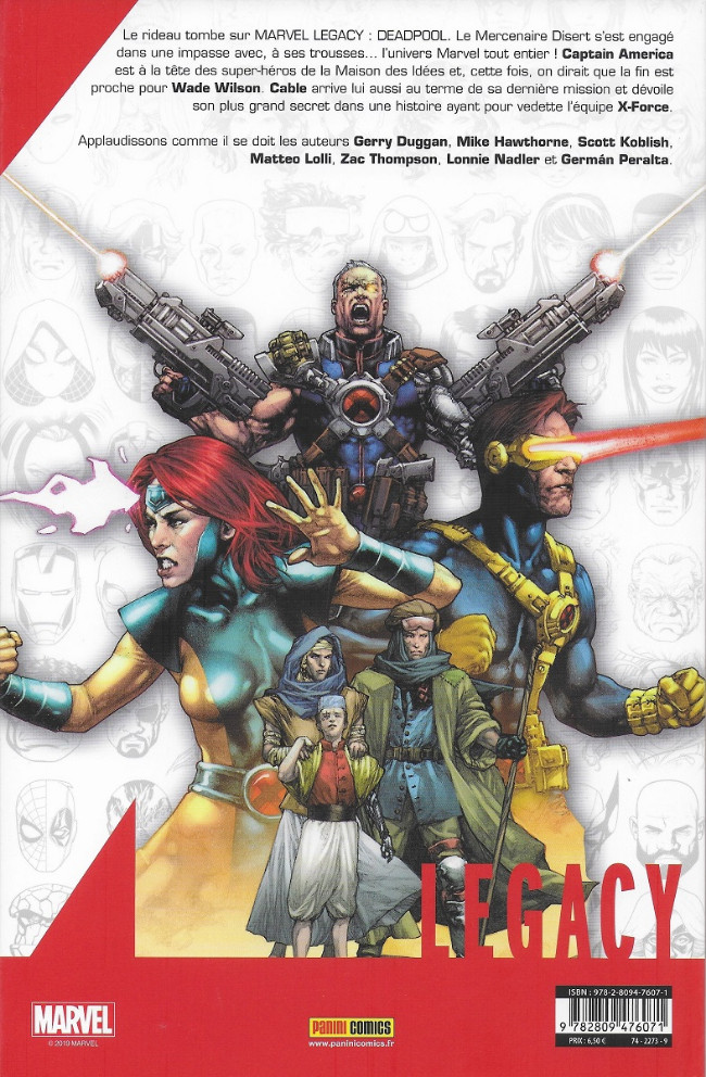 deadpool relève son plus grand défi en affrontant une équipe de super-héros menée par Captain America. C'est la fin d'une époque pour le Mercenaire Disert et pour Gerry Duggan, Mike Hawthorne, Matteo Lolli et Scott Koblish, dans une aventure de 60 pages ! Cable voit aussi se conclure sa saga Nuances de Grey, dans deux histoires signées Z. Thompson, Peralta et Nadler.