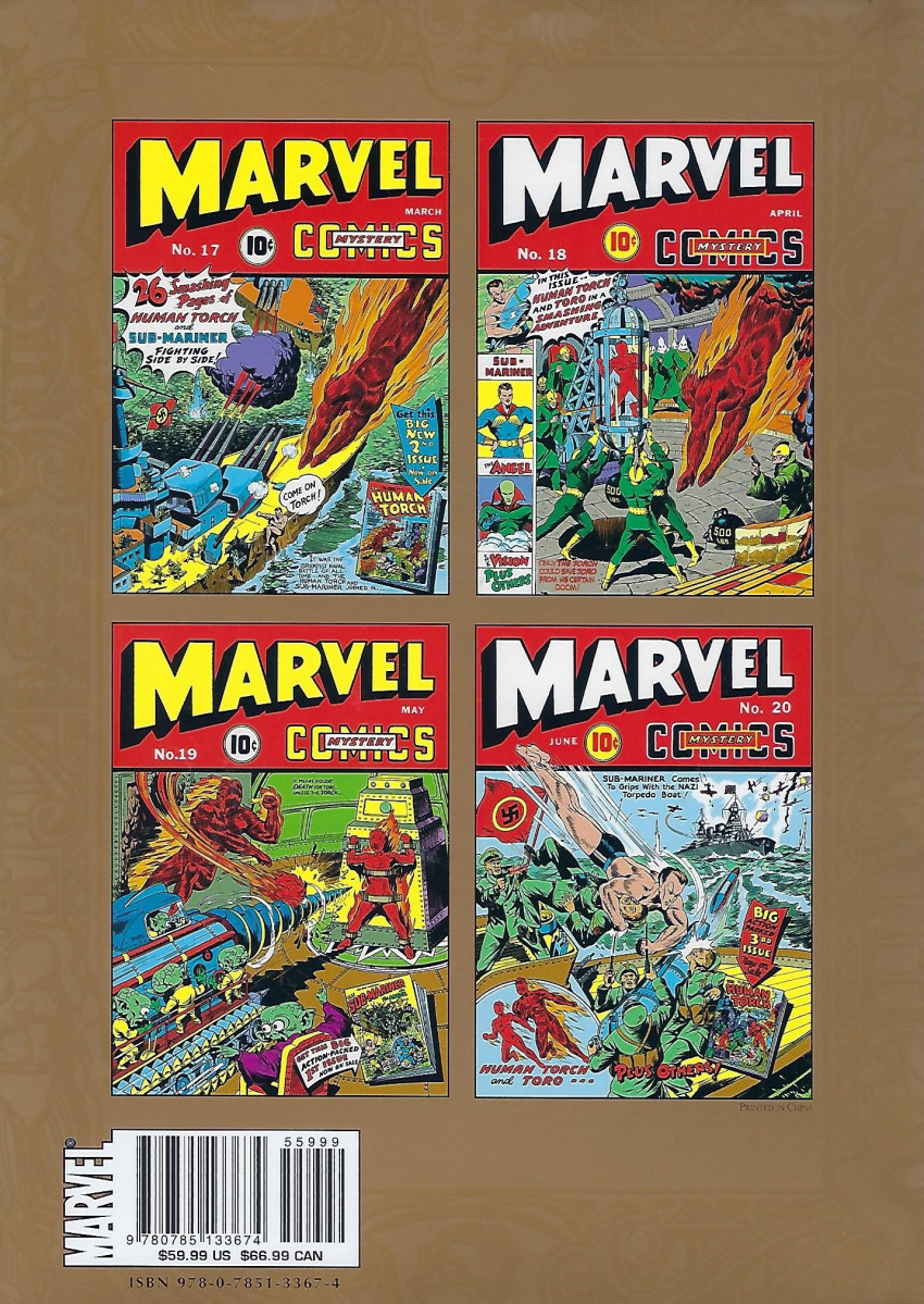 Résumé: he greatest comic magazine of the Golden Age returns with the Marvel Masterworks! Headlining the heavy-hitters of the Timely era, Marvel Mystery Comics has it all'from top-of-the-field super hero action to bizarre mystery, otherworldly noir, jungle adventure and boy detectives! And it all starts off with the history-making Human Torch/Sub-Mariner team-up by the titanic talents Carl Burgos and Bill Everett! Then the Human Torch's sidekick Toro, the Flaming Kid, makes his Marvel Mystery debut. Prince Namor, the Sub-Mariner, takes his uniquely anarchic brand of action straight to the Nazis' noses, while the Angel's origin is revealed and he begins a multi-part crusade against the sexy villainess, the Cat's Paw. Rounded out by Jack Kirby's eerie agent of vengeance, the Vision; the wonderfully weird Electro; Terry Vance, School Boy Sleuth; and the adventures of Ka-Zar, it's the classic package that made Marvel famous!