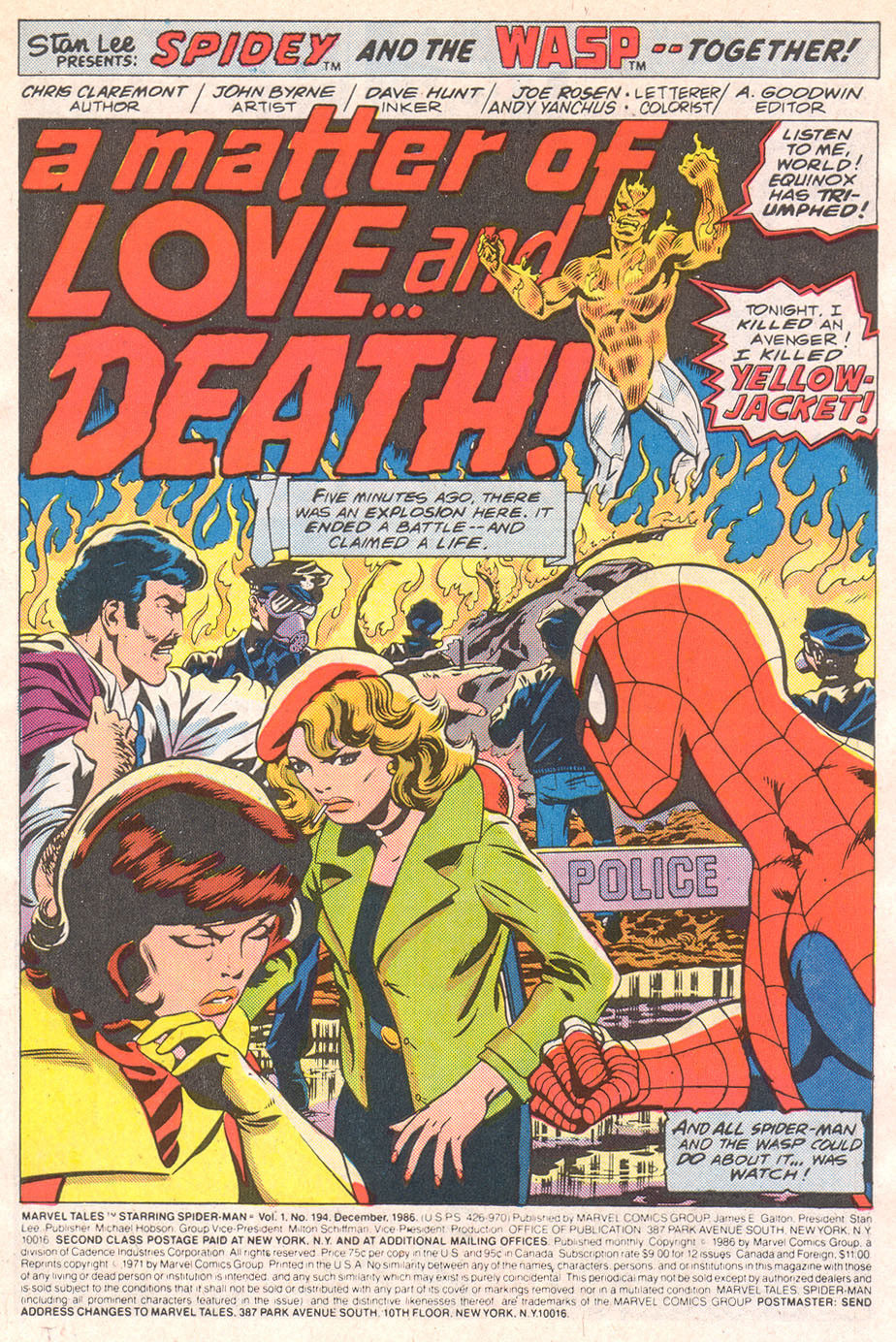 Résumé: Equinox is on a rampage on the Queensborough Bridge, and during the course of his battle against Spider-Man, the Wasp, and Yellowjacket, Equinox had seemingly slain Yellowjacket by exploding a tanker truck full of gasoline. Jean DeWolff and Raphael Scarfe have arrived on the scene to close off the destruction on the bridge. Furious that her husband was seemingly murdered by the villain, the Wasp jumps over the police barricade and attacks Equinox up front. However, the villain is too powerful for her to face on her own, and she is rescued from harm by Spider-Man.