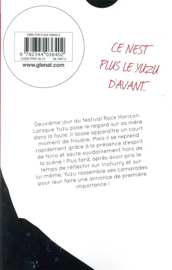 Résumé: Lorsque Yuzu pose le regard sur sa mère dans la foule, il laisse apparaître un court moment de trouble. Mais il se reprend rapidement grâce à la présence d'esprit de Nino et saute soudainement hors de la scène ! Plus tard, après avoir pris le temps de réfléchir sur Inohurry et sur lui-même, Yuzu rassemble ses camarades pour leur faire une annonce de première importance !