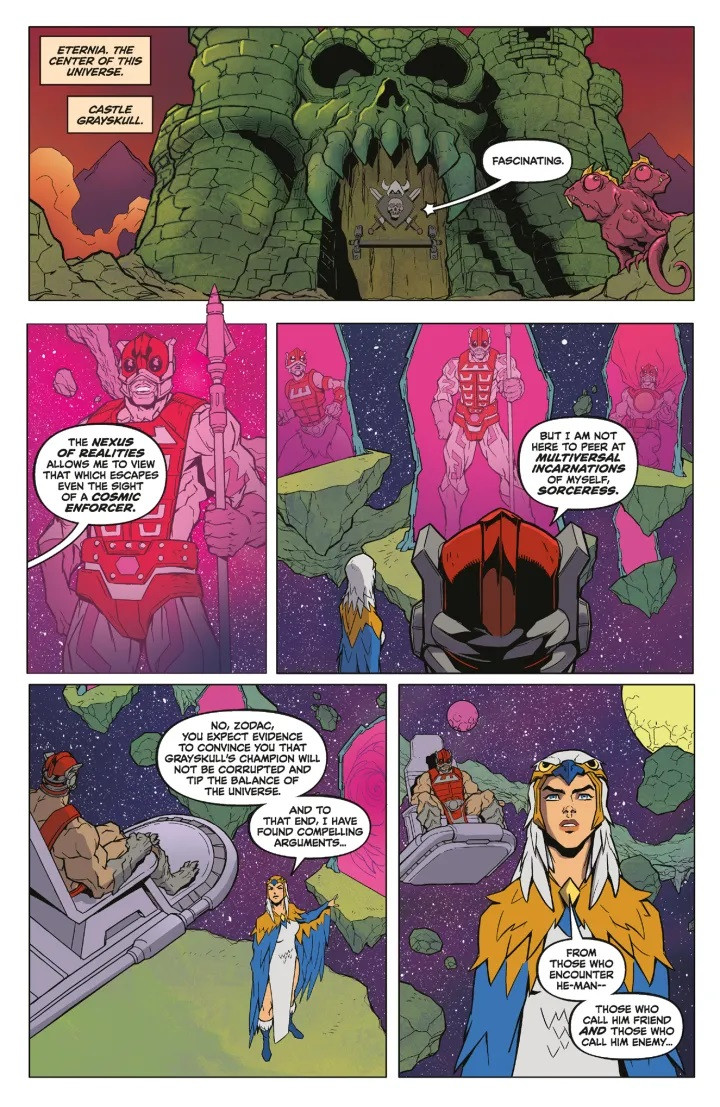 Résumé: In the depths of Castle Grayskull, The Sorceress attempts to save He-Man from Zodak with more tales of his influence across the multiverse! In a world where champions have fallen, a hard-bitten Duncan and his partner Evil-Lyn take on a strange kidnapping case in MAN-AT-ARMS-FOR-HIRE! And on the Harmony Sea, Adam, Commander of the King's army and the captured thief Jitsu search for the power to conquer Eternia!